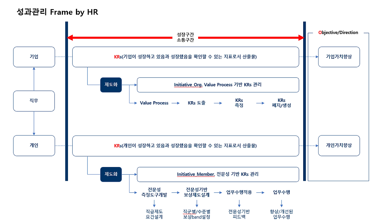 잠시 시간을 내어 생각을 도식으로 그려봅니다. 조직과 개인의 성과와 성장을 연결하는 그림을 직접 해볼 수 있는 기회가 올지는 모르겠습니다. 혼자만 가지는 아쉬움을 담아 그 도식을 간단히 기록으로 남깁니다.