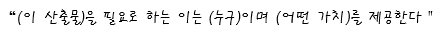 "질문이 어려우실까요? 그냥 단순하게 생각하셔도 됩니다. 예를 들어 보고서를 만드신다고 하면 그 보고를 받는 대표님이실 수도 있고 Bell이 급여작업을 하고 만든 급여내역은 회계팀에서 필요로 하겠죠. 특정 팀이 될 수도 있고 개인이 될 수도 있어요. 보고를 하는 상하관계일수도. 팀과 팀 혹은 동료 간 관계일 수도 있구요. 경우에 따라서는 다음 산출물을 위한 산출물이 될 수도 있겠죠"