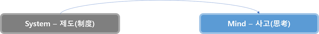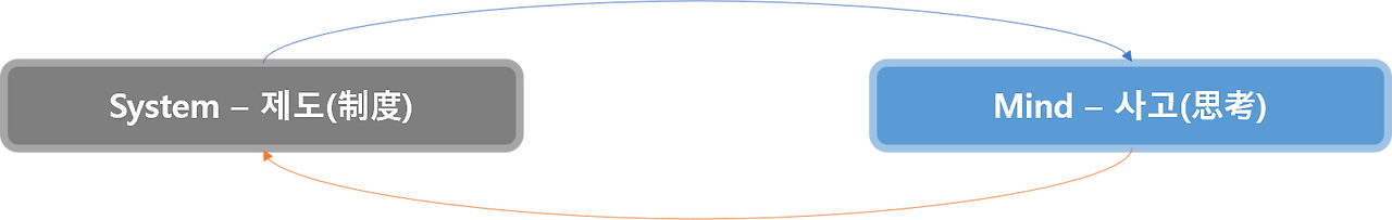 그런데 위의 그림은 제도에 사고로의 일방적 전달만 존재합니다.종전에 우리들이 경험한 상당수의 제도에서 보아왔던 모습이기도 합니다. 저는 경험해본 적이 없지만 소위 말하는 '권력부서'로서 HR이 여기에 해당하지 않을까 생각합니다. 하지만 오늘날 HR의 성격은 많이 달라졌다고 할 수 있습니다. 제도가 만들어지고 구성원이 활용하면서 실제 체감하는 수준에 대해 일종의 피드백을 받게 됩니다. 따라서 위의 system과 mind의 관계에 화살표가 하나 더 추가됩니다.