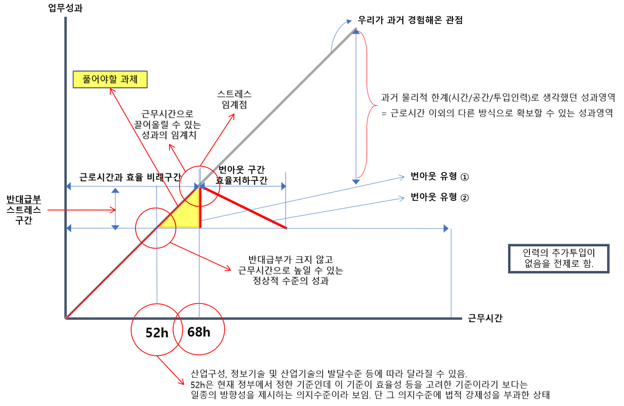 위와 같은 개념으로 이해해보면 68h이라는 지점이 제가 사회생활을 시작했을 시기에는 임계점으로 바라보지 않았으나 14년이 지난 오늘날은 이를 임계점으로 보고 있다는 것. 그리고 이 임계점이란 일종의 일과 무관한 스트레스가 누적되는 구간이므로 이 구간을 최소화하기위한 시간으로서 52h을 설정했다고 할 수 있습니다. 그리고 우리에게 남은 과제는 44h에서 40h으로 전환하는 시점에, 그리고 68h에서 52h으로 전환하는 시점에 늘 이야기하는 시간대비 효율, 즉 적은 시간을 일하면서 기존과 동일한 성과 혹은 더 나은 성과를 어떻게 확보할 것인가?(도표에서 68h에서 52h으로 근로시간이 단축됨에 따라 줄어들 수 있는 노란색 음영 부분을 어떻게 확보할 것인가?)에 대한 해결책이겠죠.