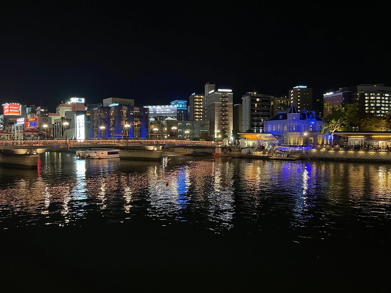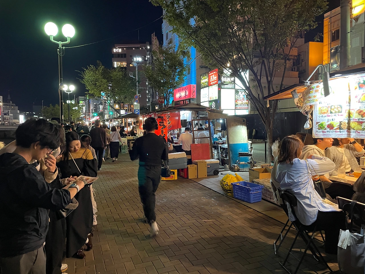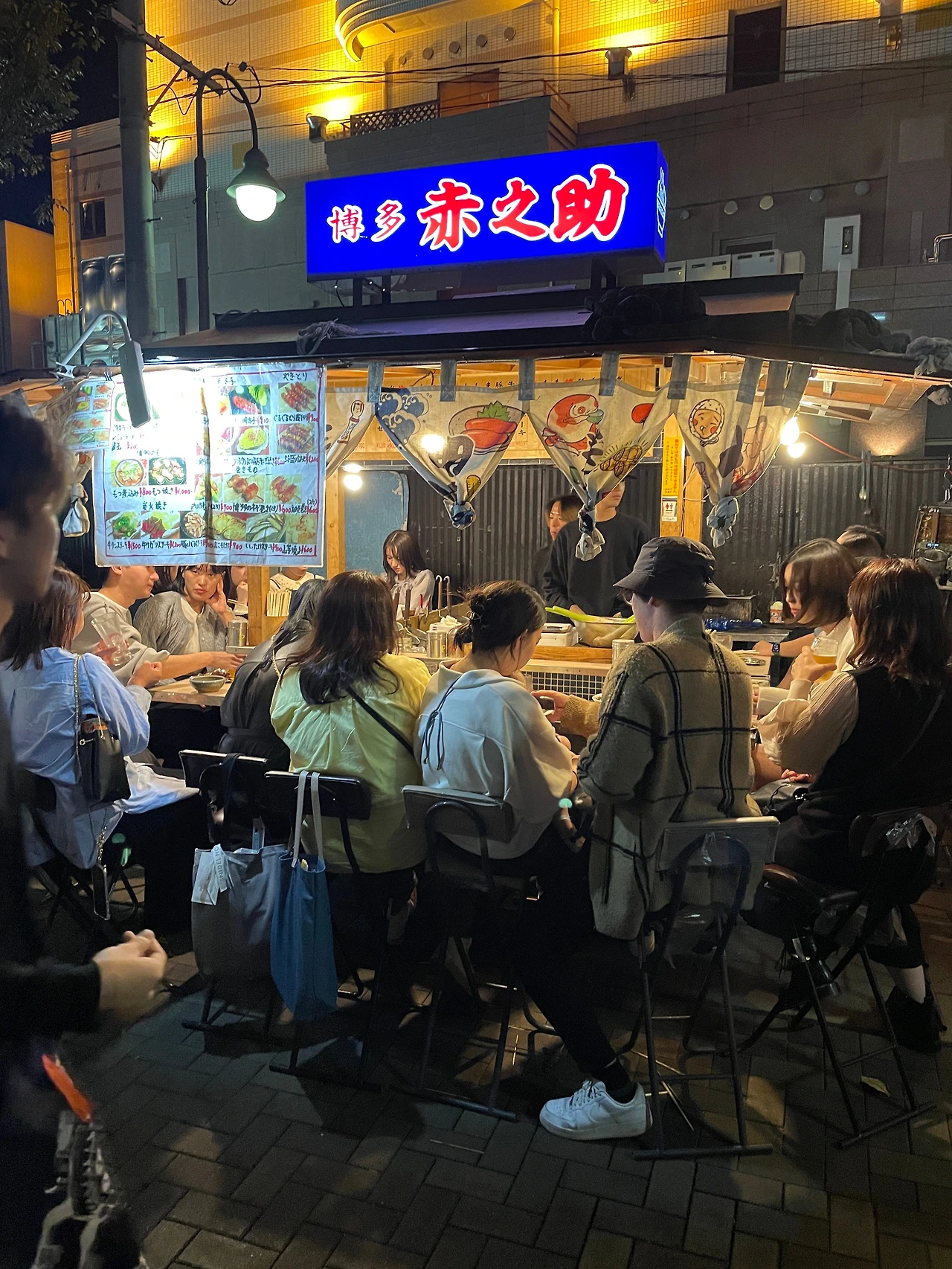 남편이 가고 싶어 했던 나카스강변 야타이(포장마차). 강을 따라 길게 포장마차가 줄을 지어 서있었고 많은 사람들이 마음에 드는 포장마차 앞에 줄을 지어 기다리고 있었다. 웨이팅이 기본이기는 하지만 회전이 빨라 그리 오래 기다리지는 않았다. 사진에서 보듯 또 좁은 공간, 작은 의자에 딸을 안고 몸을 앉혔다. 사서 고생이 이런 건가. 짧지만 깊은 대화 몇 마디를 나누며 못 마시는 술을 곁들여 그간의 소회를 나누는 게 포차가 가진 의미 아닐까 생각해 오던 나는 좁은 공간에 울어대는 딸과 주문한 명란젓과 모듬 꼬치를 빨리 먹고 나올 수밖에 없었다. 이렇게 첫 일본 여행은 수박 겉핥기식으로 끝나겠구나 생각했다.