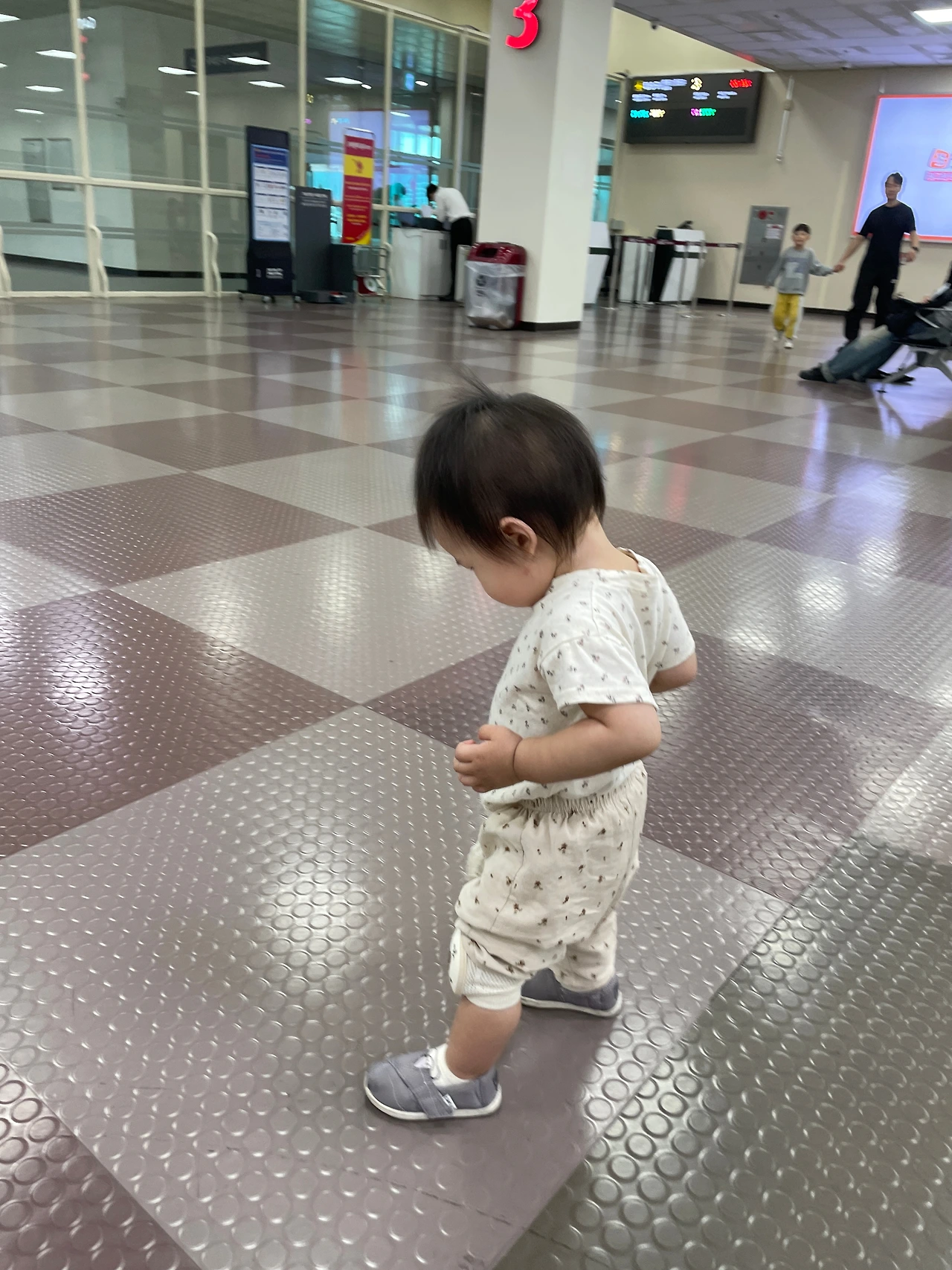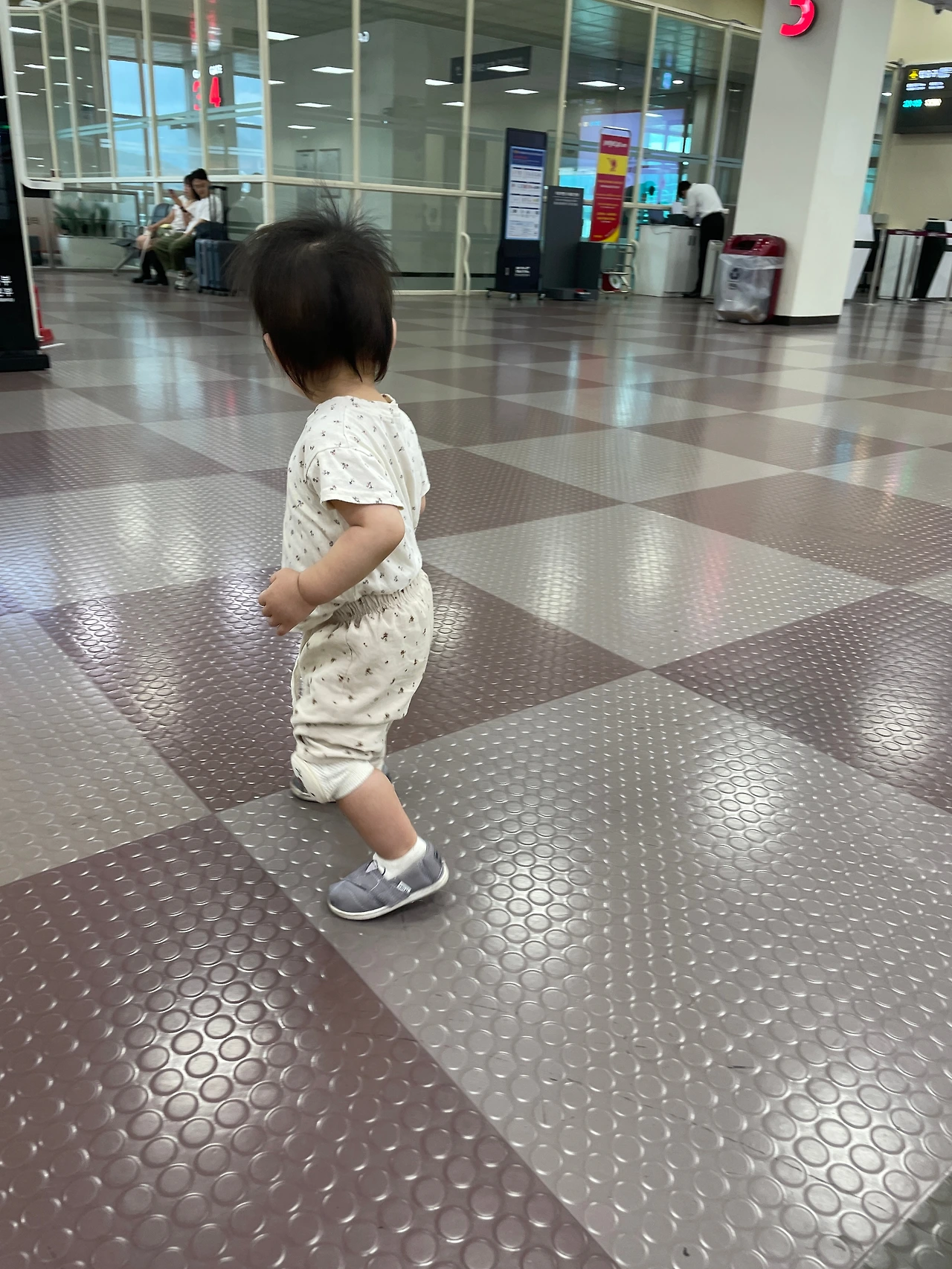 잠시 어색해하더니 걷는다! 온 공항 바닥을 면세점을 사람들 사이사이를 걷고 또래 친구들도 만나 인사를 나누고 기분 좋은 함성소리를 내지른다. 그렇게 공항에서 첫 야외 발자국을 내딛는 날이 되었다. 딸의 모습을 찍은 사진과 영상을 부모님들이 계신 단톡방에 올리니 엄청 기뻐하신다. 드디어 밖에서도 걷는다고.