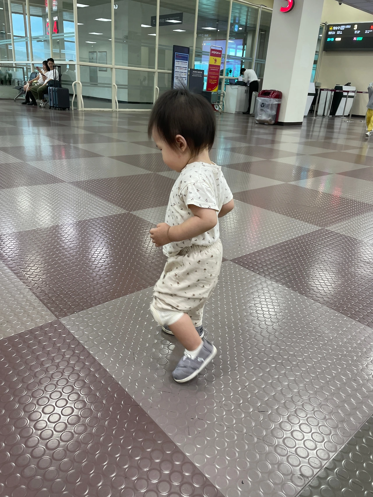 공항 안으로 들어가 셀프체크인, 수하물을 맡기고 보안검색 후 우리가 통과해야 할 게이트 앞 의자에 짐을 두고 의자에 앉았다. 그리곤 딸에게 무릎보호대를 착용시키고 신발을 신긴 후 공항 바닥에 서게 했다. 두근두근. 남편과 나는 딸이 어쩌는지 잠시 지켜보기로 했다. 지금 이 순간 전까지 집 밖에서 걸어본 적이 없다. 항상 맨발로 혹은 양말을 신고 실내에서만 걷다가 선물 받은 신발을 집에서 신겨보니 어색한지 서지도 않고 신발을 신은 자신의 발만 쳐다보던 딸이었다. 일으켜 세워줘도 털썩 앉던 딸.