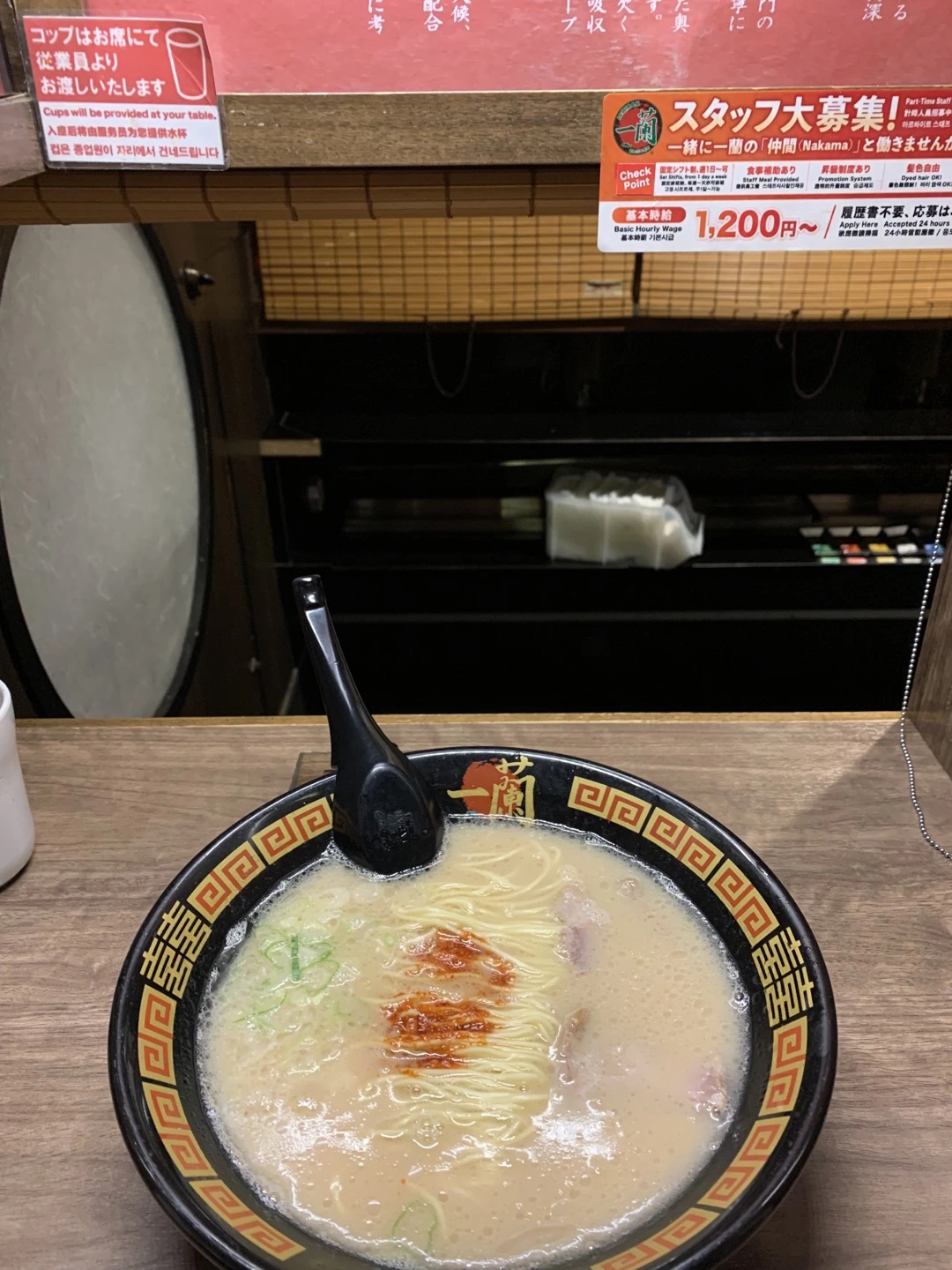 약 40분쯤 남편과 이런저런 이야기를 하며 기다리다 딸을 아기띠로 안고 식당 안으로 들어갔다. 대표 메뉴 돈코츠라멘을 키오스크로 주문하고 식당 안으로 들어가니 와 정말 공간이 협소했다. 남편이 안으면 우는 딸을 내가 아기띠로 안고 한 명이 들어가기에 조금의 여유 공간 없이 딱 맞는 자리로 들어가는 기분이란. 구겨 넣는다는 표현이 딱 맞다. 그렇게 불편하게 제대로 음미할 시간 없이 진하고 걸쭉한 육수가 맛있고 인상 깊다는 느낌을 빠르게 체감하고 서둘러 나왔다. 그럼에도 불구하고 숨통 트이게 해 준 것이 있었으니 아사히 생맥주. 한국에서 먹는 것과는 완전히 달랐다. 크리미하고 시원한 맥주. 술을 못하는 내가 첫 한 모금에 눈이 동그래져 와 대박이라고 말해버렸다. 일본에서 계속 느껴온 답답함을 많이 해소시켜 주었던 아사히 생맥주. 그것마저 없었다면 너무 힘들었던 후쿠오카에서의 첫날이 되었을 듯.