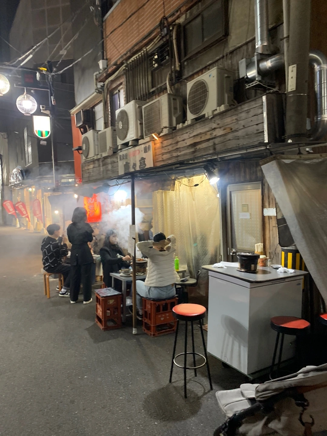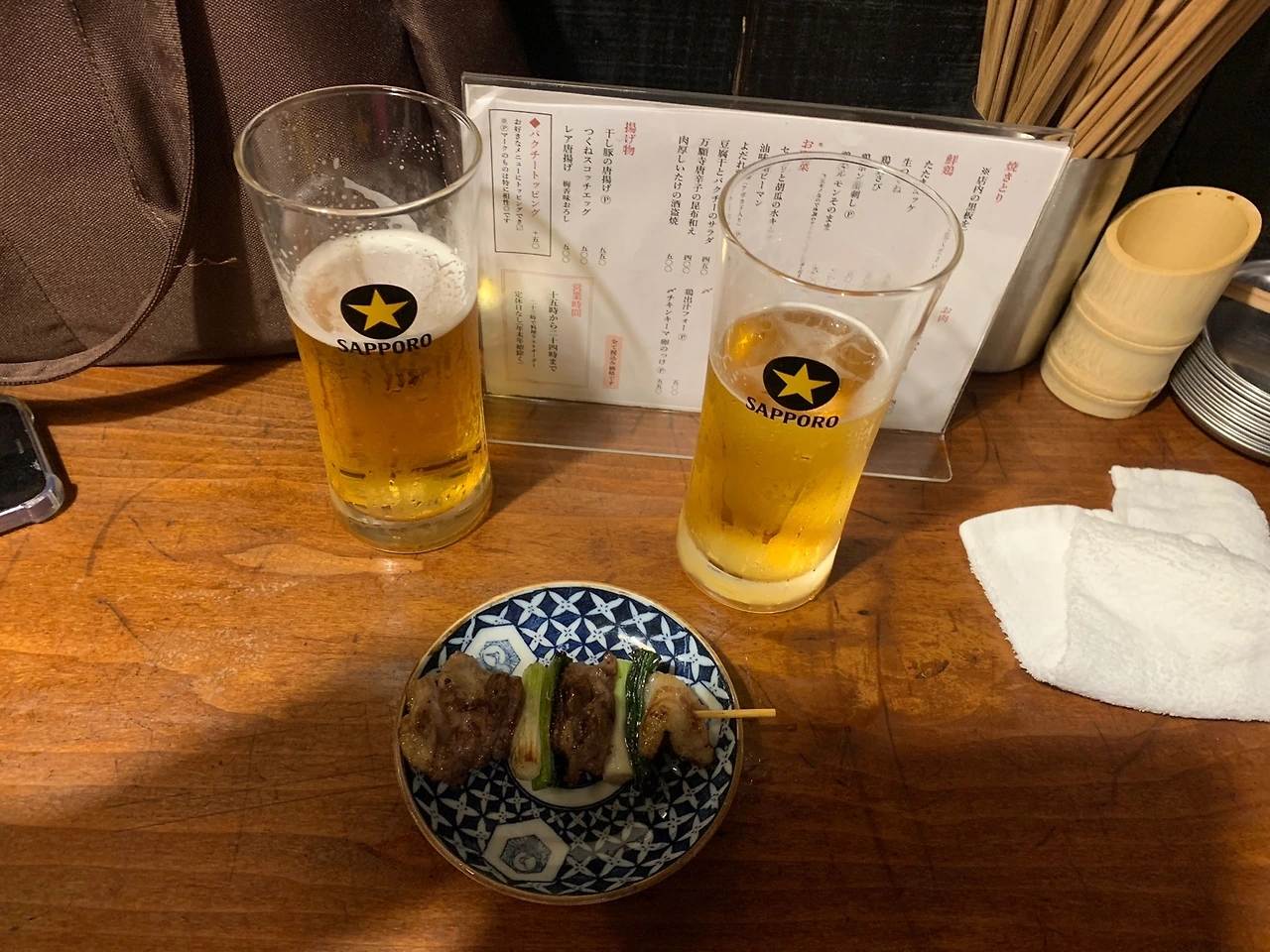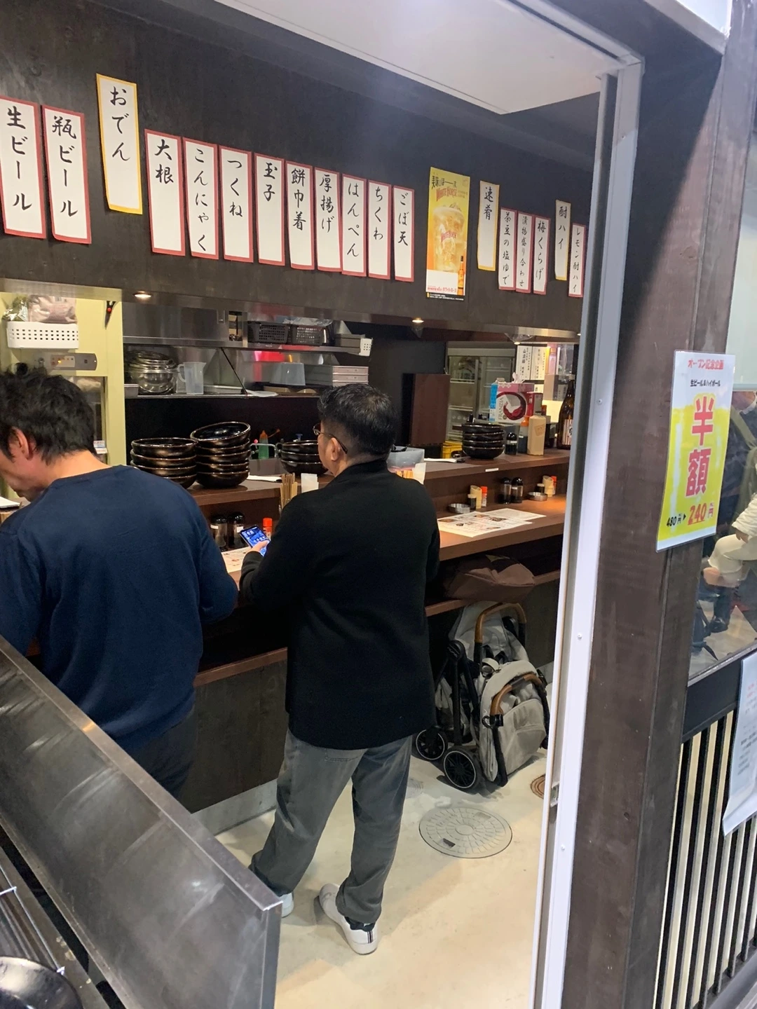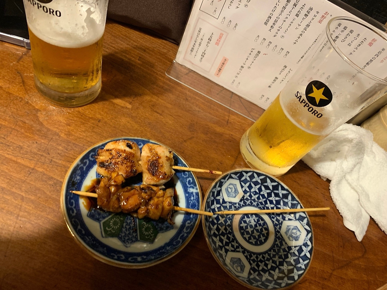 이번에는 남편이 미리 알아둔 야끼토리(꼬치구이) 집을 방문했다. 외국인은 우리뿐이라 일본 현지인들로 가득한 그곳은 공간도 협소해 휴대용 유아차와 기저귀 가방을 들고 가게 안까지 들어가는 것이 몹시도 민망하였다. 문을 열자마자 우리를 쳐다보는 얼굴들이란. 낑낑. 힘들게 안 쪽에 자리를 잡았다. 이곳은 이색적 이게도 의자가 없이 서서 담소를 나누며 술을 곁들여 야끼토리를 즐기는 곳이었다. 사람과 사람 사이에 1 제곱미터의 빈 공간도 허락되지 않아 외국인이자 일본어도 하나도 못하는데 좁은 공간에 많은 짐을 이고 들어온 우리는 더 머쓱했다.