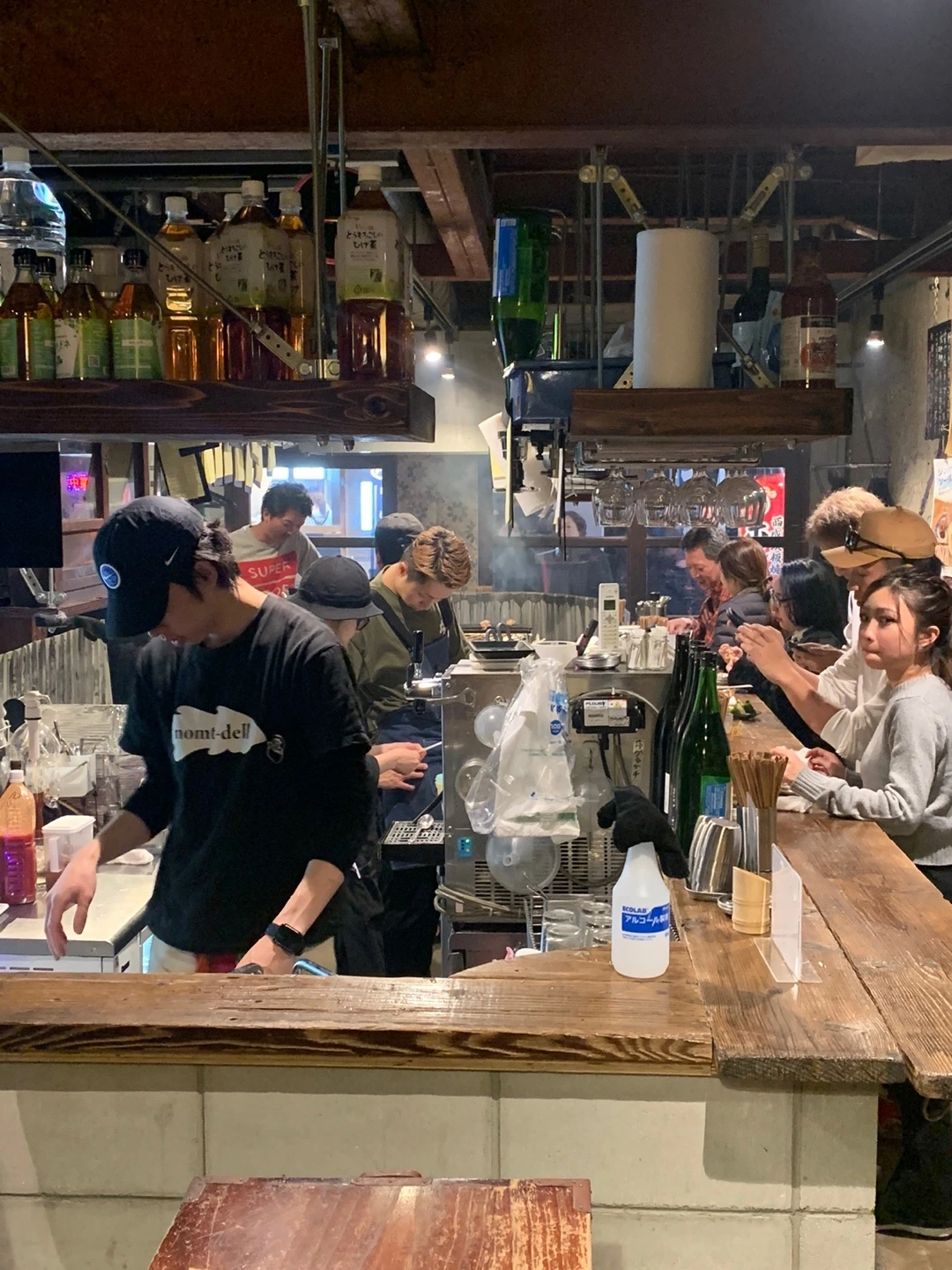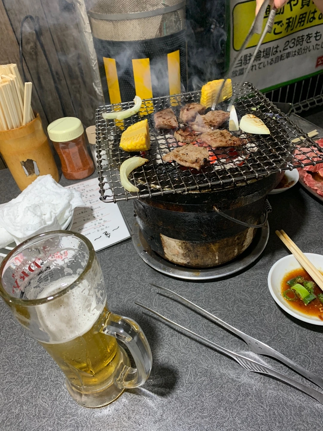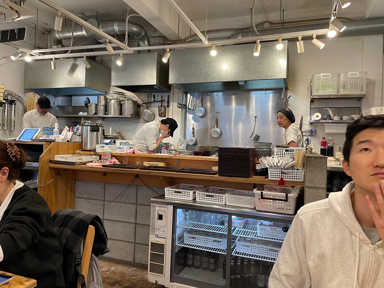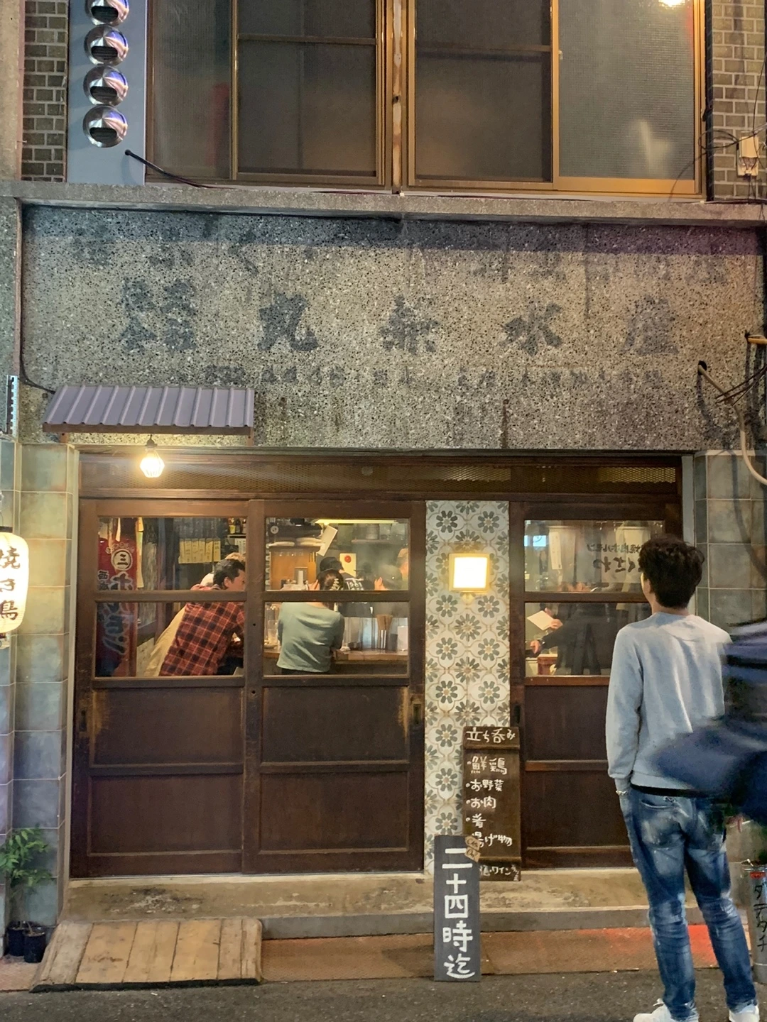 이번에는 남편이 미리 알아둔 야끼토리(꼬치구이) 집을 방문했다. 외국인은 우리뿐이라 일본 현지인들로 가득한 그곳은 공간도 협소해 휴대용 유아차와 기저귀 가방을 들고 가게 안까지 들어가는 것이 몹시도 민망하였다. 문을 열자마자 우리를 쳐다보는 얼굴들이란. 낑낑. 힘들게 안 쪽에 자리를 잡았다. 이곳은 이색적 이게도 의자가 없이 서서 담소를 나누며 술을 곁들여 야끼토리를 즐기는 곳이었다. 사람과 사람 사이에 1 제곱미터의 빈 공간도 허락되지 않아 외국인이자 일본어도 하나도 못하는데 좁은 공간에 많은 짐을 이고 들어온 우리는 더 머쓱했다.
