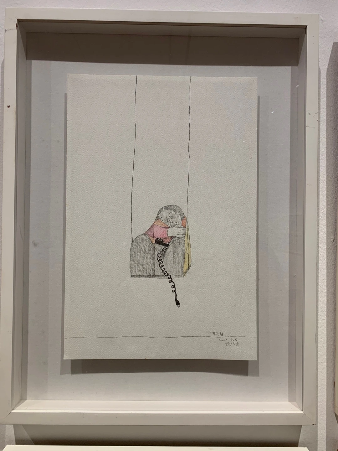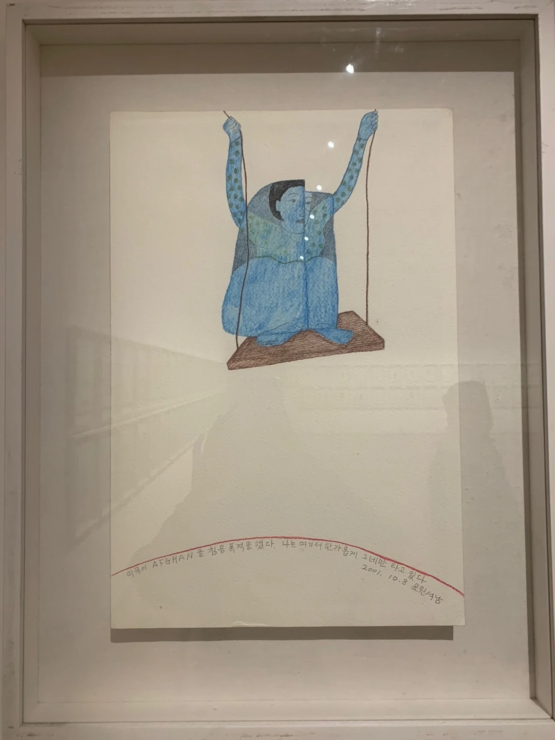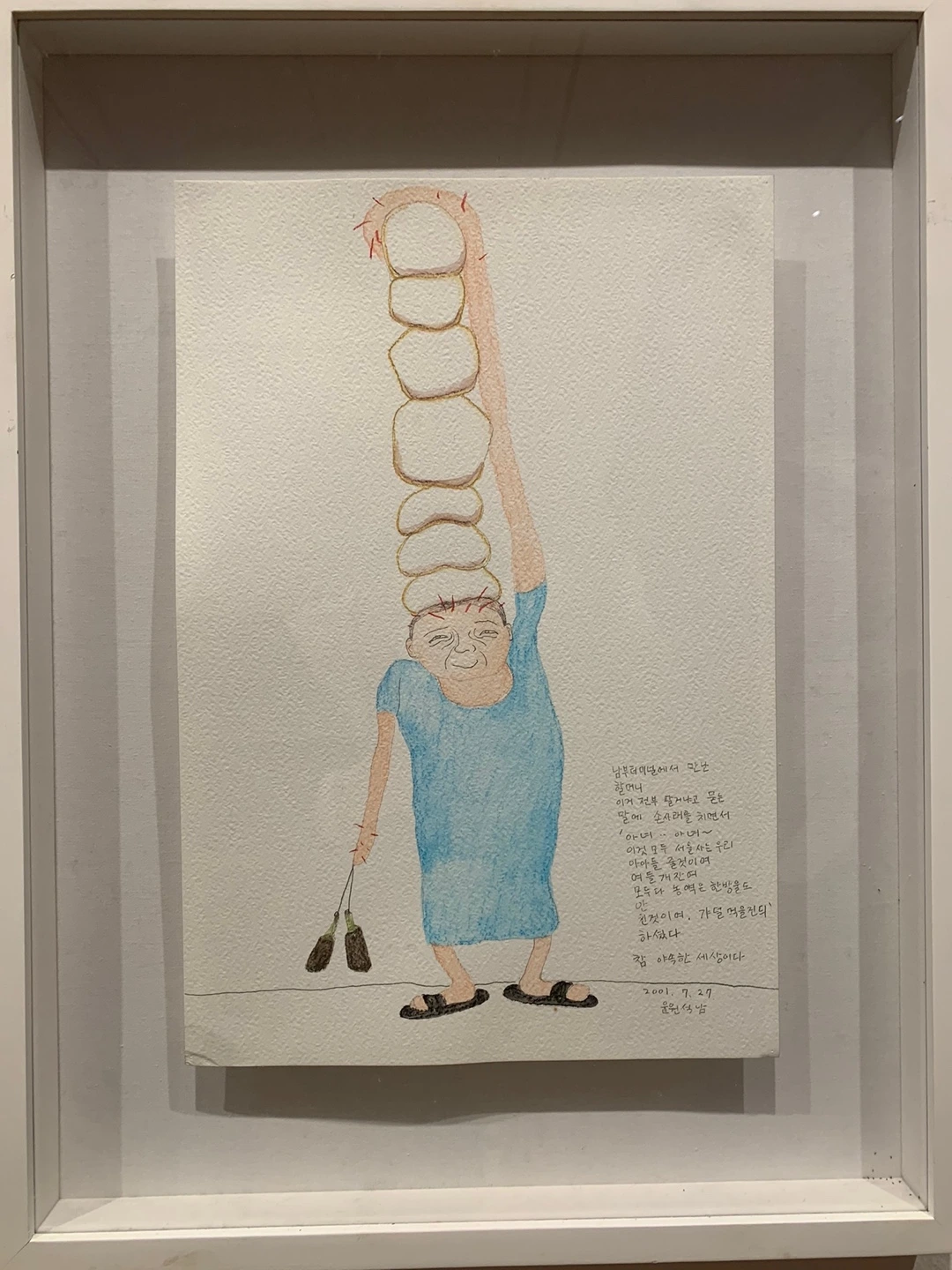 내가 특히 전시에서 주목해서 본 것은 작가가 그림일기처럼 그린 작품들이었다. 2001년에서 2003년 사이에 일기를 쓰듯 수많은 드로잉을 남겼다고 한다. 작가의 다른 작품들과 비교하면 작품으로 볼 수 없는, 정말 말 그대로 일기로 가볍게 보일 수 있는 것들이었다. 하지만 작가의 그림에 대한 진정한 열정과 그걸 증명하는 그간의 성실함과 습관화된 결실을 그 작품들로 보는 것 같아 다른 작품들만큼 가볍지 않게 다가왔다. 또한 드로잉의 제목과 글귀는 그녀의 문학적 면모를 볼 수 있어 독서와 글쓰기를 좋아하는 나로서는 무척 흥미로운 부분이었다.