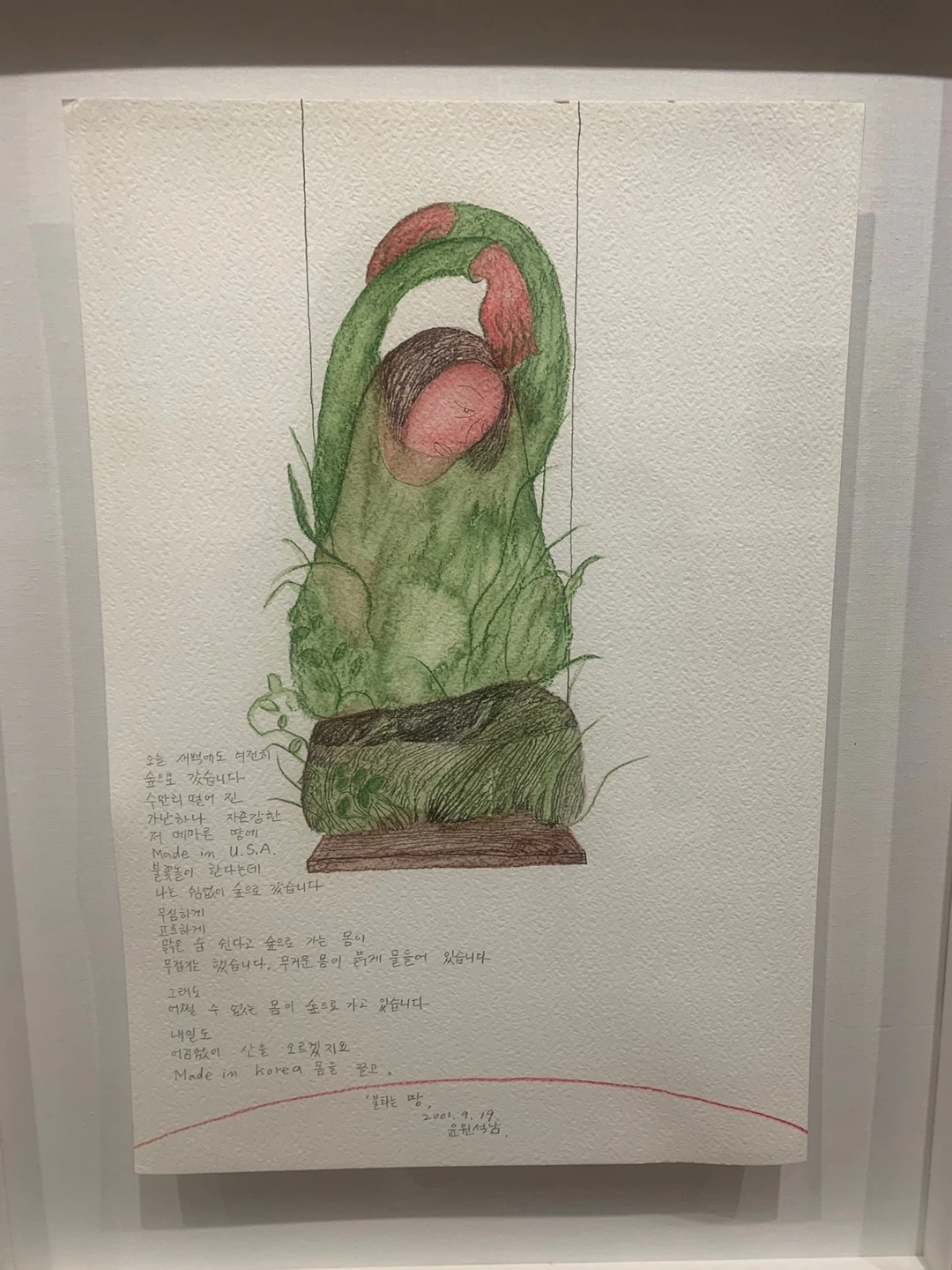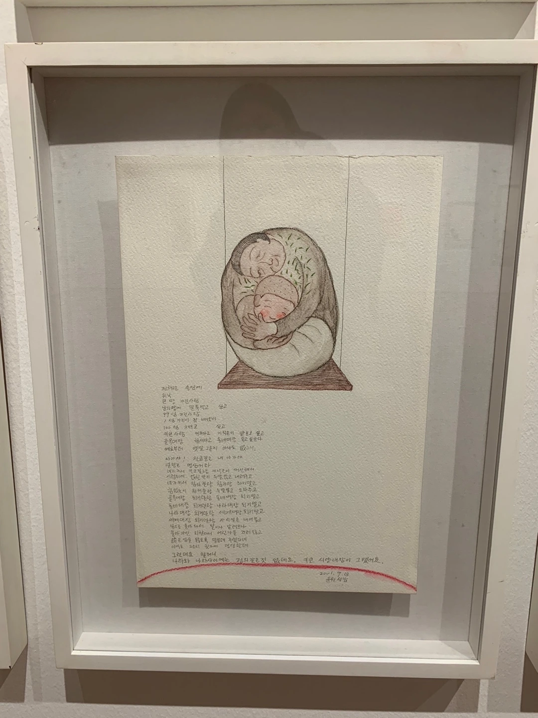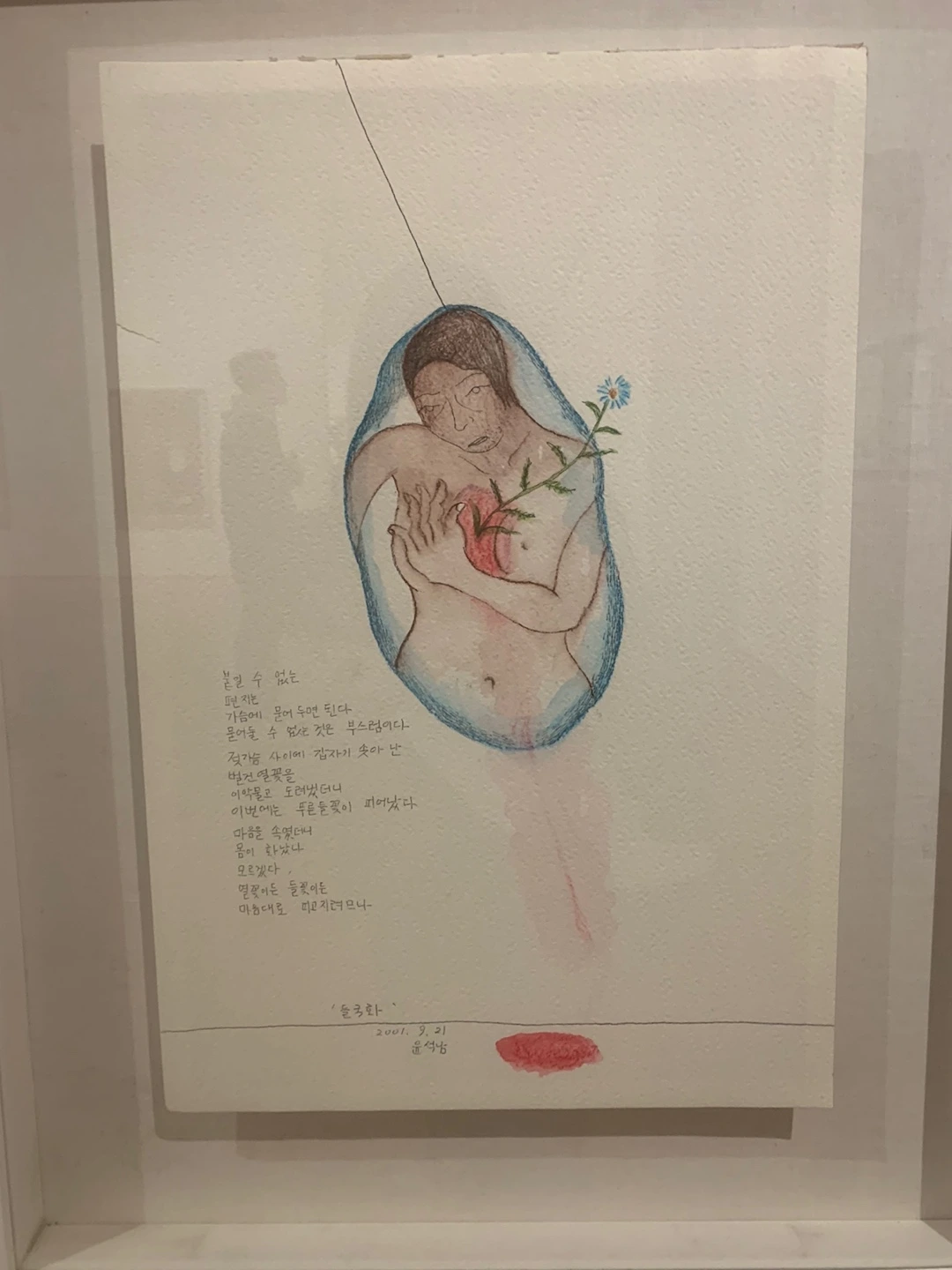 내가 특히 전시에서 주목해서 본 것은 작가가 그림일기처럼 그린 작품들이었다. 2001년에서 2003년 사이에 일기를 쓰듯 수많은 드로잉을 남겼다고 한다. 작가의 다른 작품들과 비교하면 작품으로 볼 수 없는, 정말 말 그대로 일기로 가볍게 보일 수 있는 것들이었다. 하지만 작가의 그림에 대한 진정한 열정과 그걸 증명하는 그간의 성실함과 습관화된 결실을 그 작품들로 보는 것 같아 다른 작품들만큼 가볍지 않게 다가왔다. 또한 드로잉의 제목과 글귀는 그녀의 문학적 면모를 볼 수 있어 독서와 글쓰기를 좋아하는 나로서는 무척 흥미로운 부분이었다.
