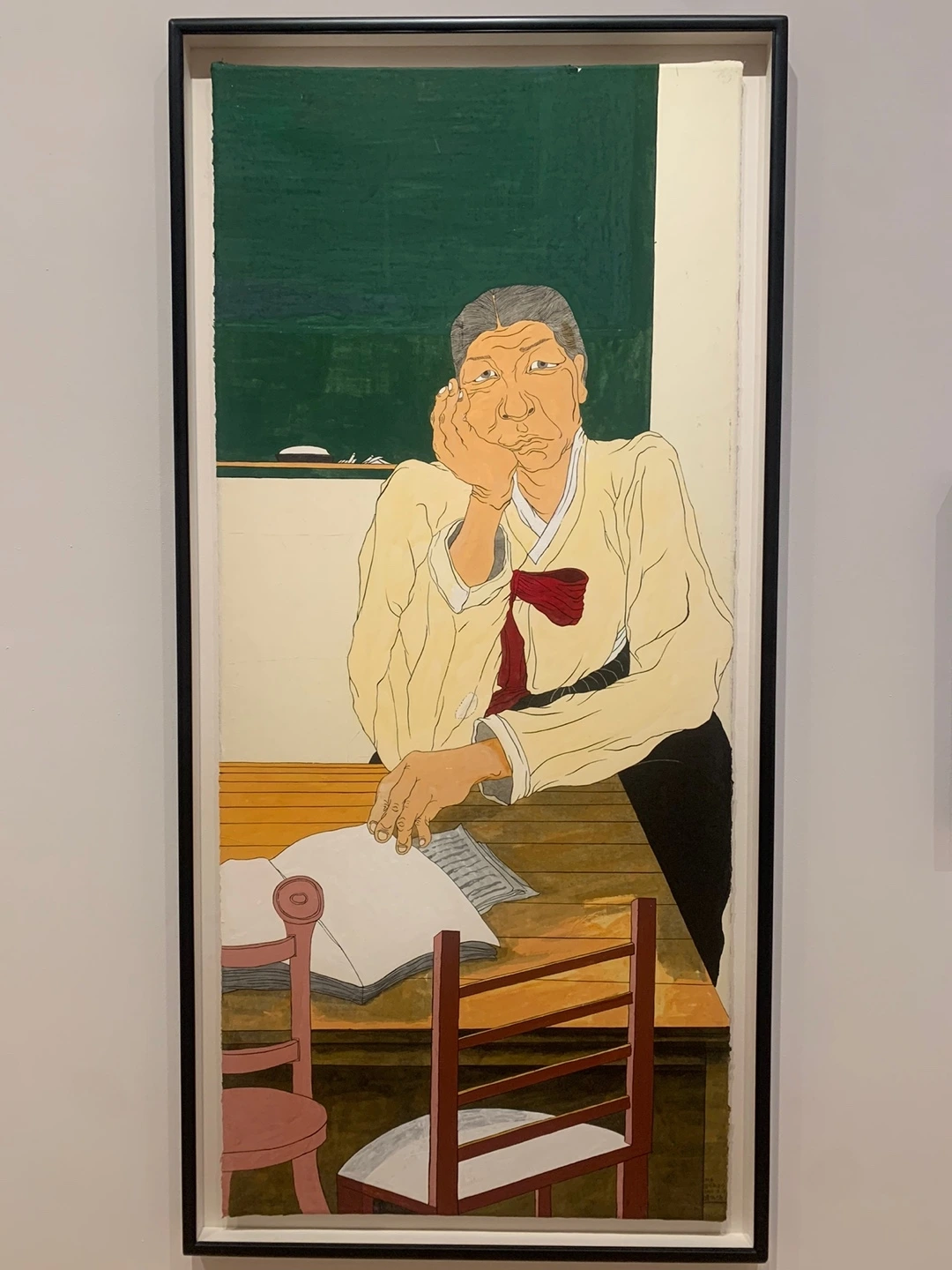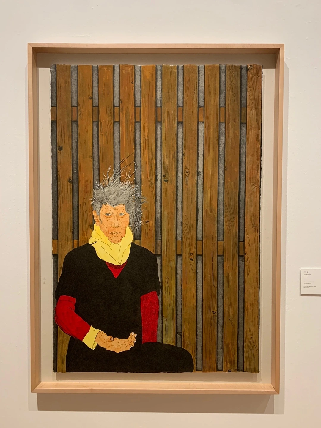 윤석남 작가의 자화상이 걸려 있었다. 아 이렇게 생기신 분이구나. 이런 옷 스타일을 입고 이런 색을 좋아하시는구나. 하며 앞의 그녀의 작품들을 보며 상상해 왔던 내 머릿속 작가님과 비교, 대조하며 감상했다. 상상 속 작가님과는 사뭇 다른 분이 작품에 올라와 있어 살짝 놀라긴 했다. 동시에 작가님만의 어떤 분위기가 실제 작가님이 앞에 계시는 것이 아니라 그림으로 보는 것임에도 뿜어져 나오는 듯했다.