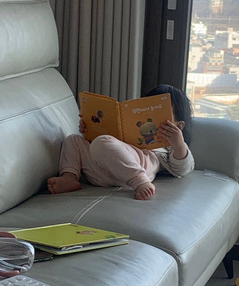 오늘은 눈을 뜨니 딸이 소파에 앉아 등을 소파로 편히 기댄 채 책을 읽고 있다. 18개월 딸이 전과 다르게 커가는 모습을 새삼 보는 것 같아 폰으로 사진을 찍고 영상으로 담느라 일어나자마자 바빴다.