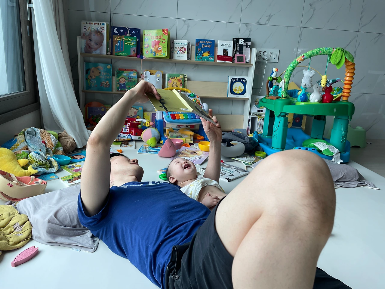 자주 읽던 책이라도 시기를 두고 주기적으로 바꿔서 읽어주려고 하는 나와 달리, 남편은 주로 읽던 책을 반복적으로 읽혀준다. 자주 읽혀주는 책이라 지루하지 않을까, 시시하지 않을까 하는 염려와 달리 딸은 자주 보던 그림이라 그런지 더 집중하는 것 같고 익숙하고 친한 친구를 만난 듯 책 표지를 보여주면 더 좋아한다. 웃으며 책을 읽으러 엄마, 아빠에게 다가와 자신을 위해 활짝 벌린 팔에 머리를 베는 모습이 사랑스럽다.