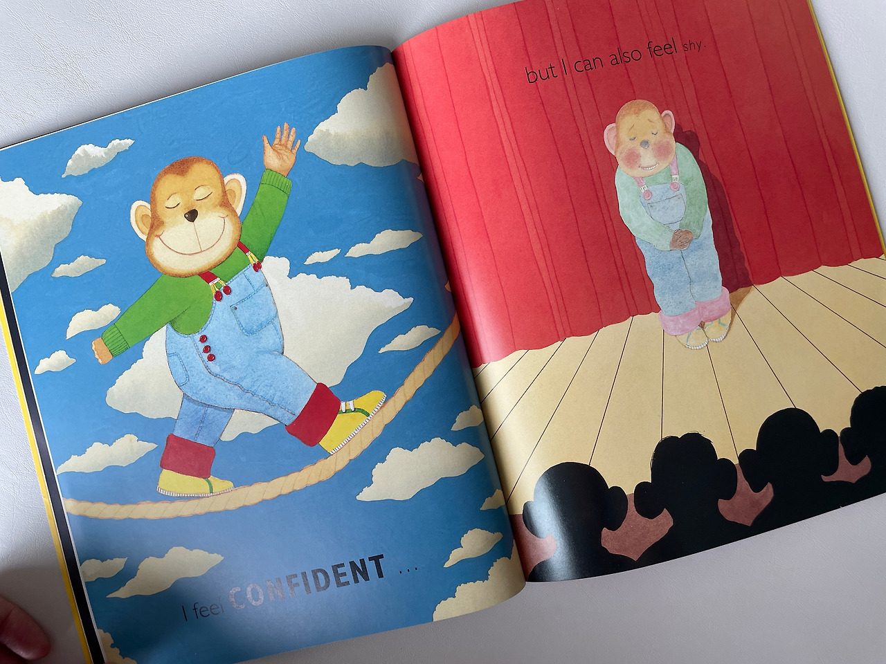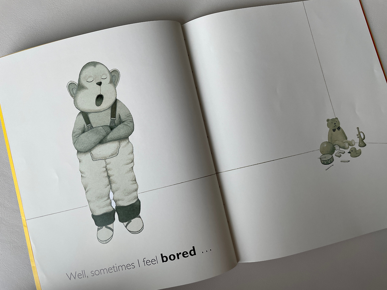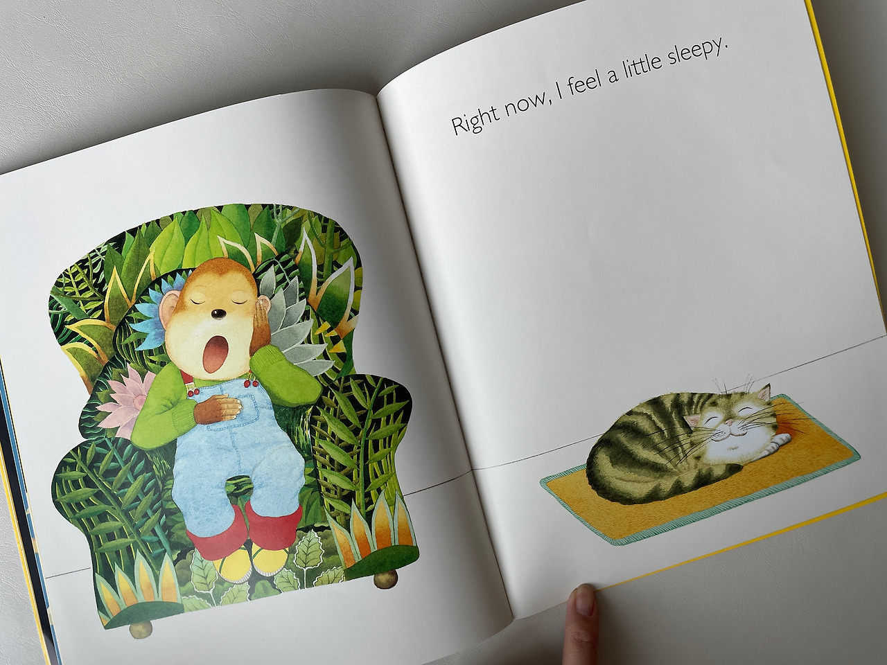 <How Do You Feel?>의 노래는 재생과 동시에 흘러나오는 흥이 나는 선율과 리듬으로 몸을 쉬이 들썩이게 만든다. 그래서 신나는 노래를 들으며 춤도 추고 리듬에 몸을 맡기며 흘려듣기로 익숙해진 뒤 책을 함께 보며 읽어주었다. 책 내용도 영어로 몇몇 감정이나 상태 관련 형용사들을 이해하기 쉽게 잘 묘사한 그림들로 한 장씩 구성돼 있다. 읽을 땐 목표 형용사(책 내 진하게 표시된 부분)를 더 강하고 세게 불러주고, 그 의미를 이해할 수 있게 엄마의 과장된 연기력으로 표정, 제스처를 가미했다. 가령, happy의 경우 "하하하" 하며 웃고, sad의 경우 눈물을 흘릴 것 같은 표정으로 불렀다. bored나 sleepy의 경우엔 우리말도 사용했다. "심심해", "아이 졸려 아함~"처럼.