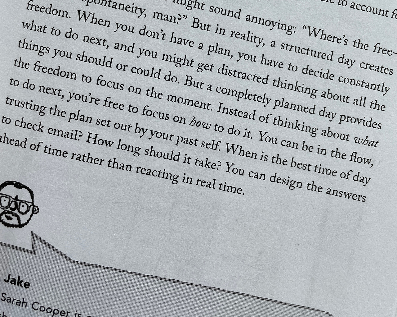 But, *in reality, a *structured day creates freedom. When you don't have a plan, you have to decide constantly what to do next, and you might get distracted *thinking about all the things you should or could do. But a completely *planned day provides the freedom to focus on the moment. Instead of thinking about what to do next, you're free to focus on how to do it. You can be in the flow, *trusting the plan set out by your past self. When is the best time of day to check email? How long should it take? You can design the answers *ahead of time *rather than reacting in real time. (책 67쪽에서) (*에 대한 설명은 글 최하단에 있습니다.)