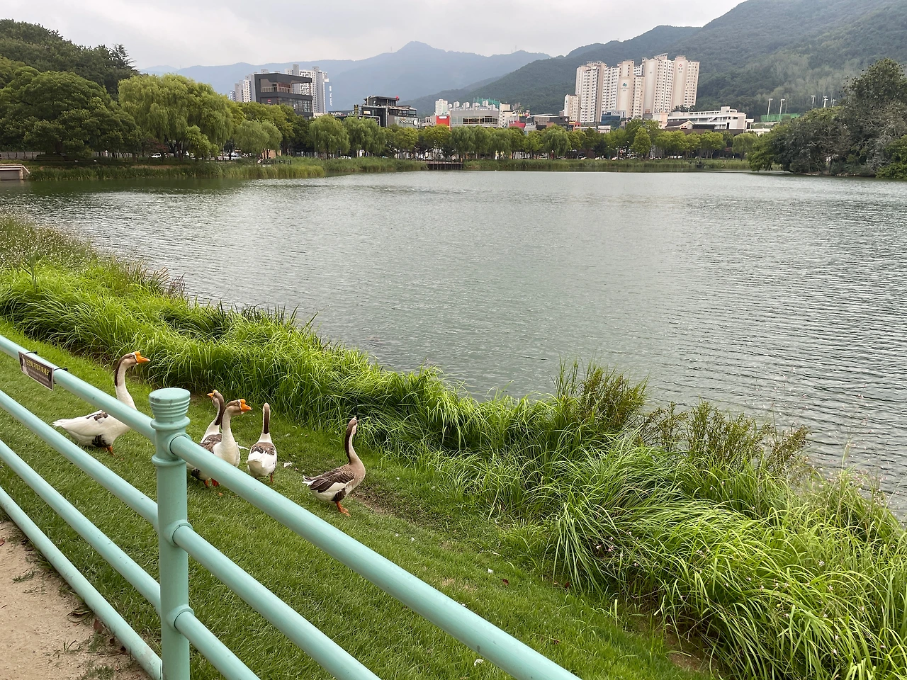 그렇게 연신 스마트폰 카메라 셔터를 누르고 있는데 거위 소리가 들렸다. 바로 옆에서 들리는 듯했다. 고개를 돌려보니 진짜 거위들이 눈앞에! 거위를 이렇게 가까이서 본 적이 없었던 것 같다. 운동하기 싫었던 나에게 보상이라도 주려는 양 거위 가족들이 마중 나온 듯했다. 처음으로 수성못이 노을을 품은 모습을 나에게 보여준 것처럼.