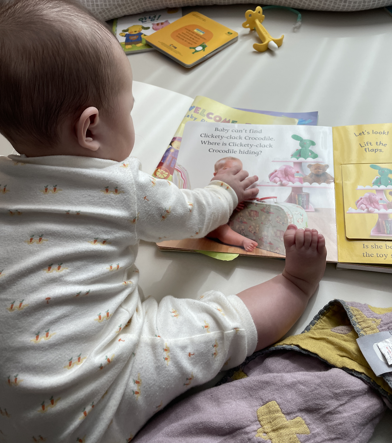 그리고 딸이 책 속 아기들 사진에 더 관심이 많은 것 같다. 영어보다 또래 아기들 또는 언니, 오빠들에 관심이 많은 편이다. 책 속 아기들 얼굴을 쓰다듬는 모습이 미소 짓게 한다. 히히.