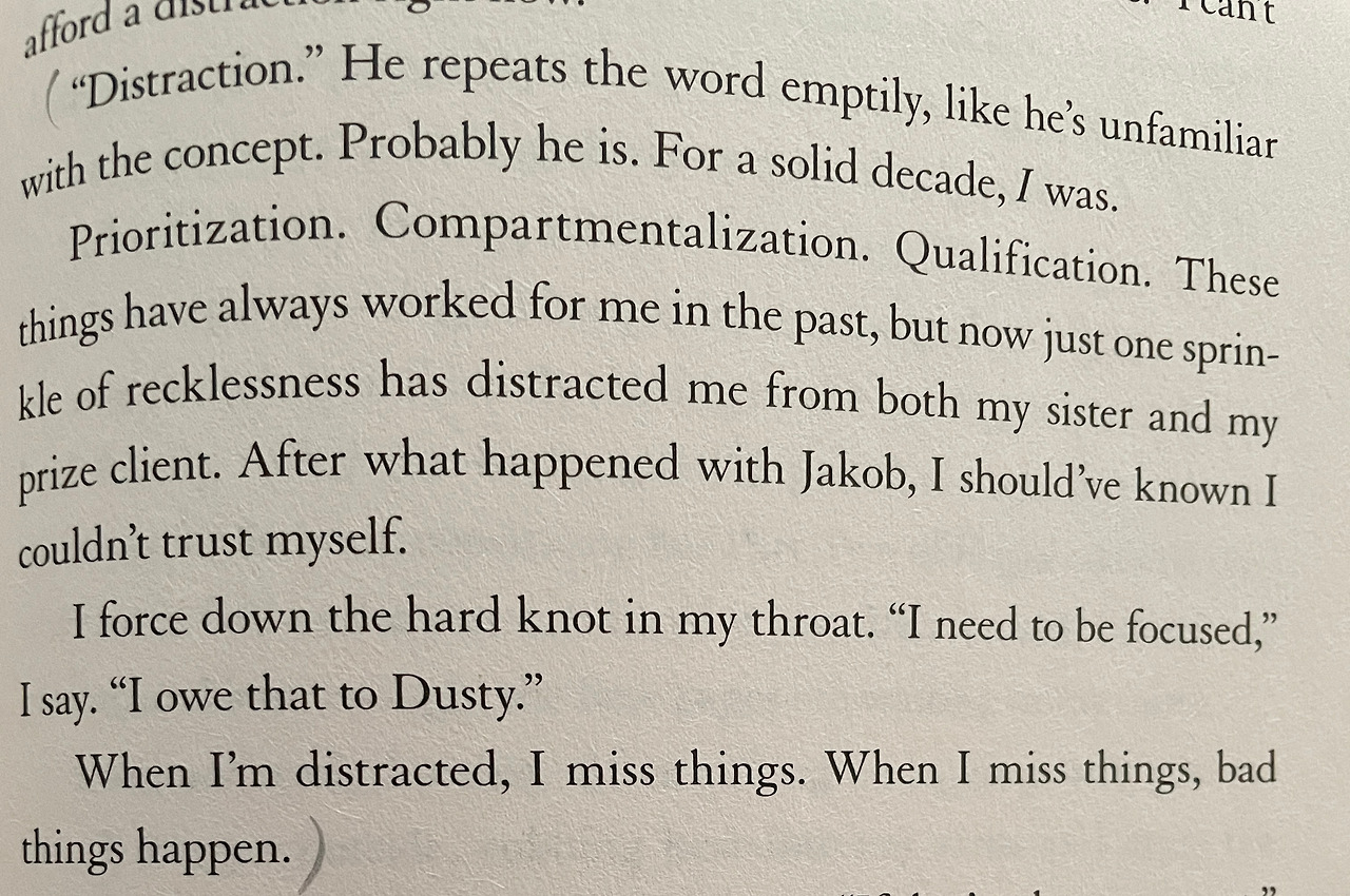 I force down the hard knot in my throat. “I need to be focused,” I say. “I *owe that to Dusty.” When I’m distracted, I miss things.