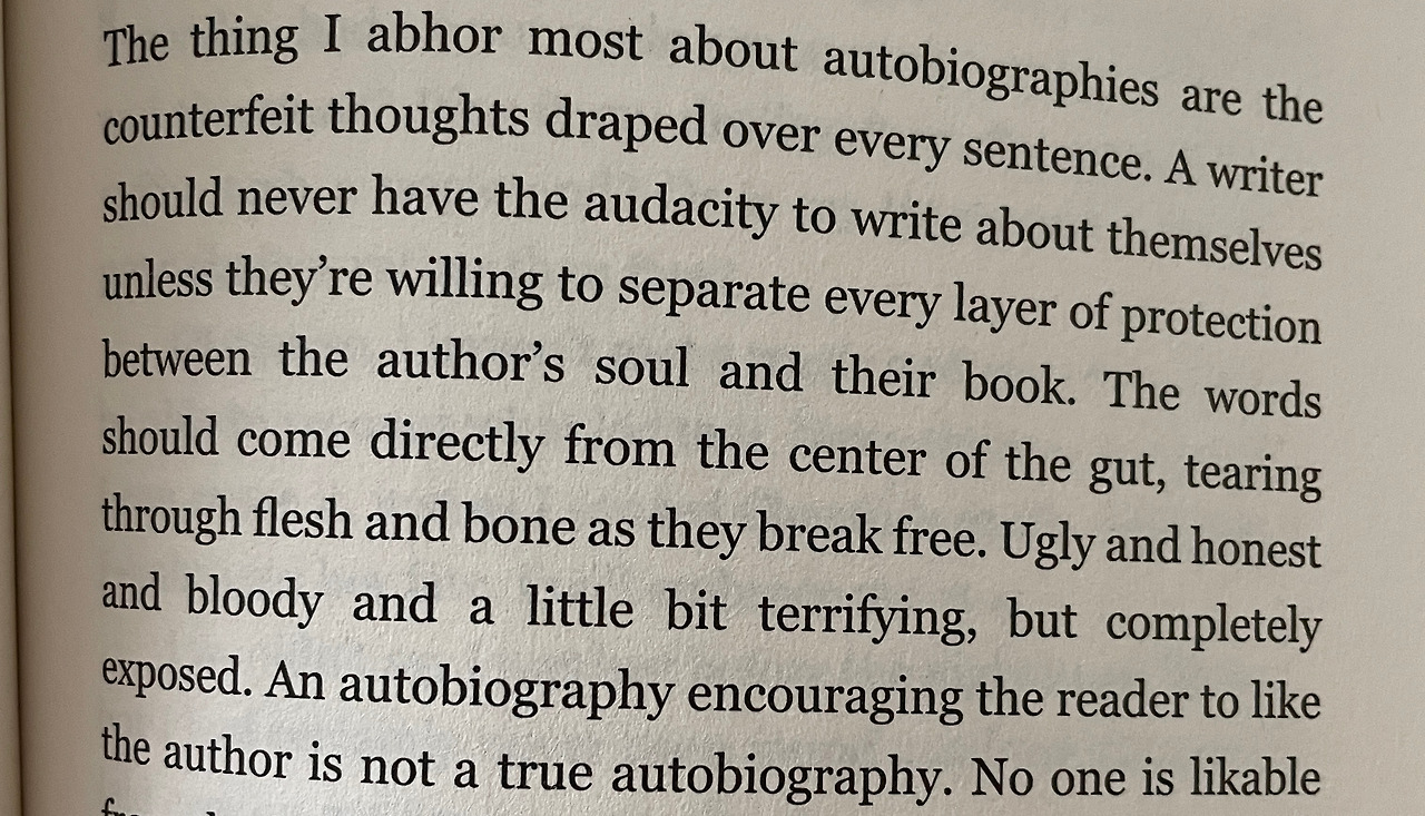 The thing I *abhor most about *autobiographies are the *counterfeit thoughts *draped over every sentence. A writer should never have the *audacity to write about themselves *unless they’re *willing to separate every *layer of protection between the author’s soul and their book. The words should come directly from the center of the *gut, *tearing through flesh and bone *as they break free. Ugly and honest and bloody and a little bit *terrifying, but completely exposed.