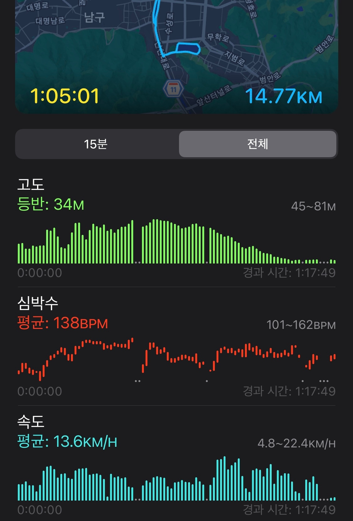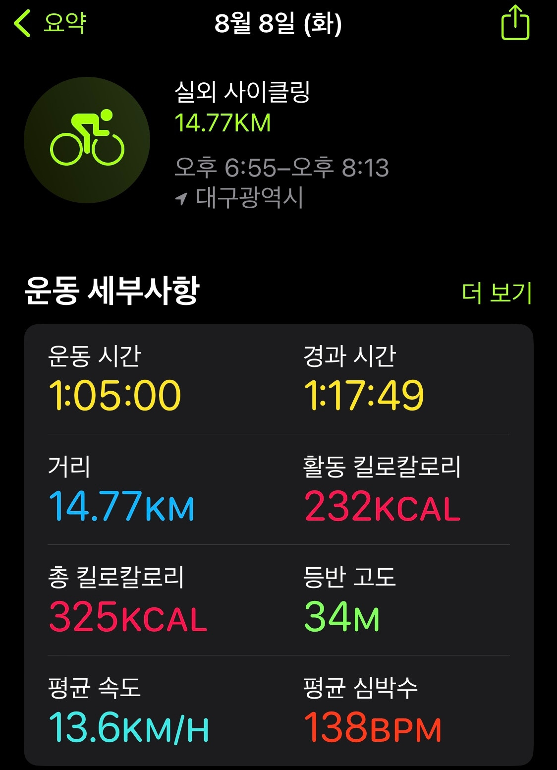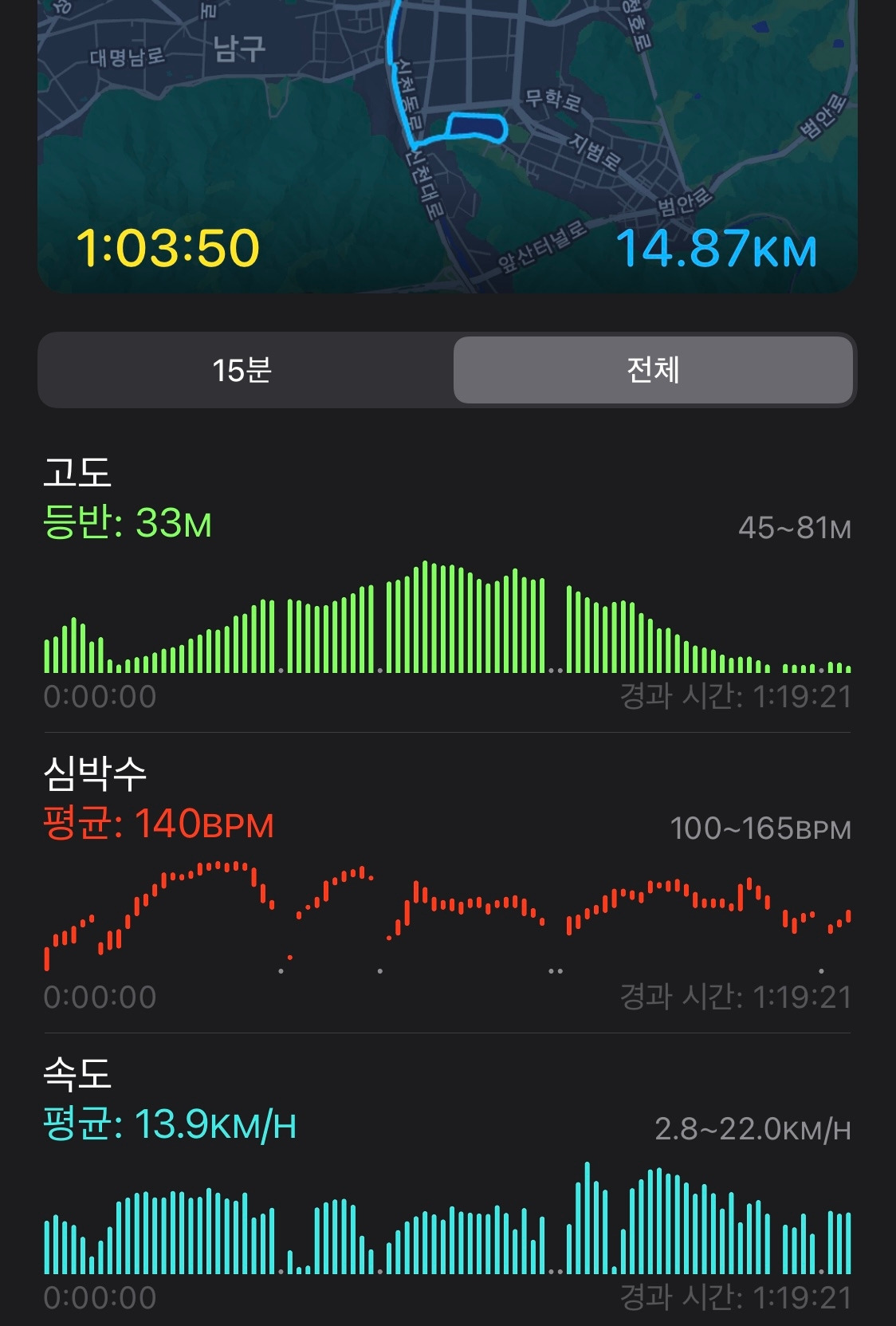 그렇게 첫날, 약 15km의 거리를 약 1시간 20분 동안 자전거를 탔고 평균 심박수는 140 bpm이었다. 러닝, 조깅을 할 때 이만큼의 심박수가 나오기란 쉽지 않다.