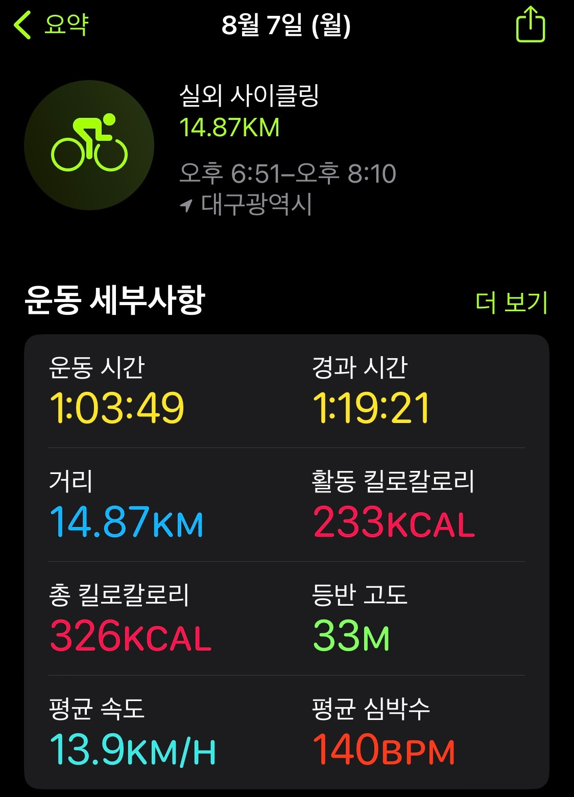 바로 다음 날, 8/8(화) 오늘이다. 어제의 그 기분을 잊을 수 없어 남편에게 아침부터 계속해서 예고했다. 오늘 저녁에도 자전거를 타러 나갈 거라고. 오늘의 목적지도 수성못. 어제와 같은 루트이다.