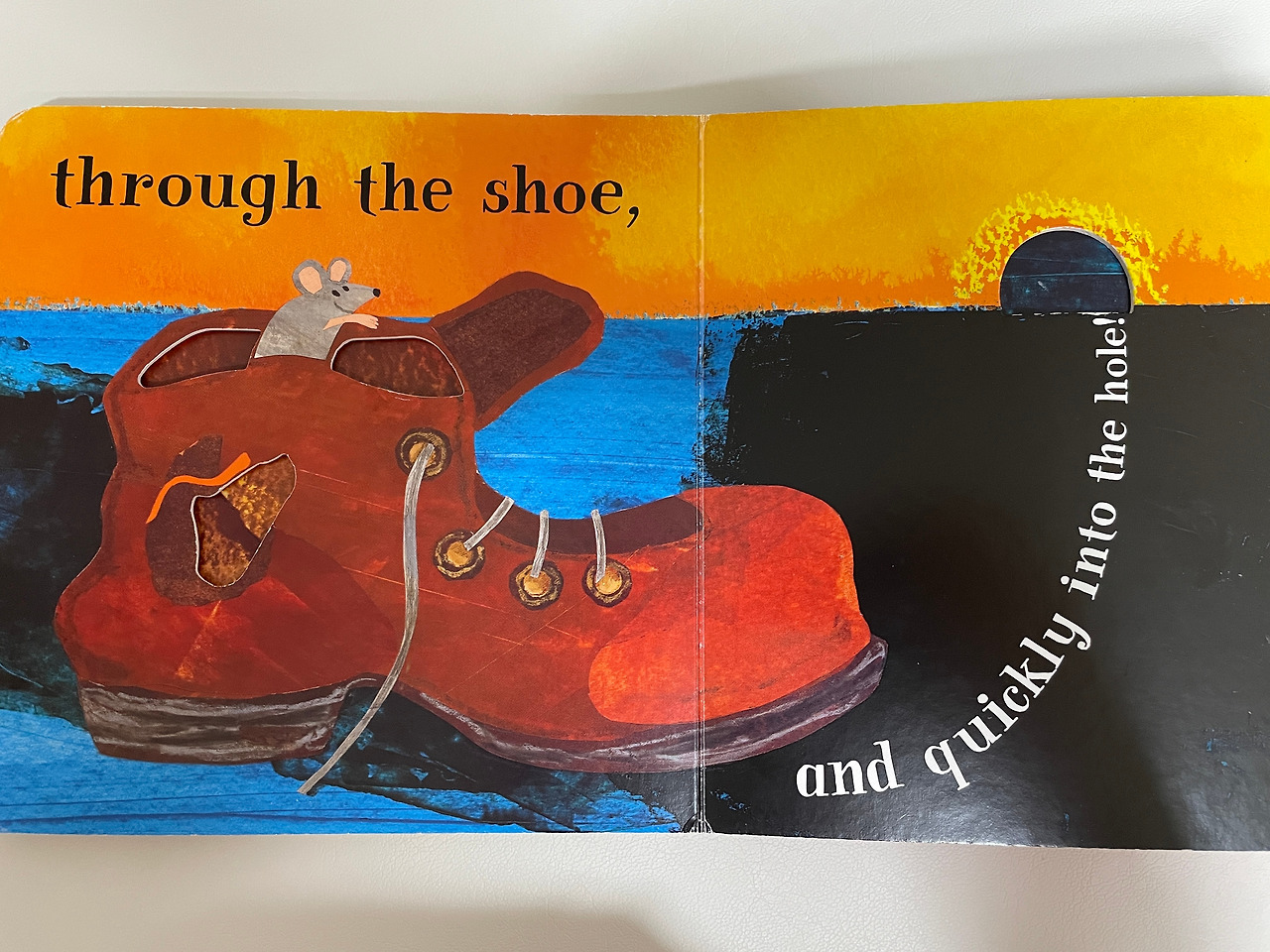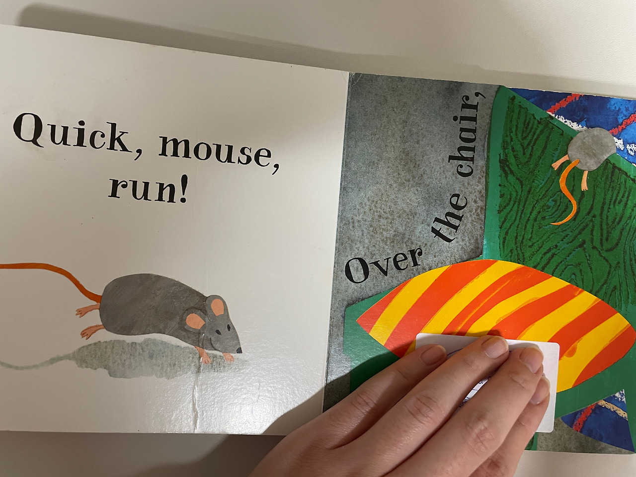 집에 돌아와 제대로 책을 읽어주기 위해 딸과 책을 펴고 앉았다. 책을 찍은 위 사진 중 첫 번째 사진에서 “Quick, mouse, run!”할 때는 두 팔을 달릴 때처럼 흔들면서 몇 번이고 똑같이 “Quick, mouse, run!”하고 딸에게 읽어줬다. 좀 더 생동감 있게 읽어주기 위해서. “Over the chair”을 읽어줄 땐 쥐의 이동경로를 손으로 그려가며 읽어주기도 하고, 집에 있는 의자를 옆에 두고 내가 의자를 쥐처럼 밑에서 위로 타올라가듯이 행동을 취하면서 “Over the chair”하기도 했다. ”across the table”, “up the cup”, “through the shoe and quickly into the hole!”도 같은 방법으로 손으로 쥐의 경로를 그려주거나 실제 집에 있는 물건을 활용해 내가 행동을 취하면서 읽어주었다. 좀 더 오버해서 극적으로 읽어주거나 책 속 상황을 내가 직접 행동으로 보여주면서 책 속 글귀를 읽어주었을 때 딸의 반응이 더 좋았다. 딸이 자고 있는 지금, 눈동자가 사라질 것처럼 반달 웃음을 짓던 딸이 아직도 내 눈앞에 보이는 듯하다.