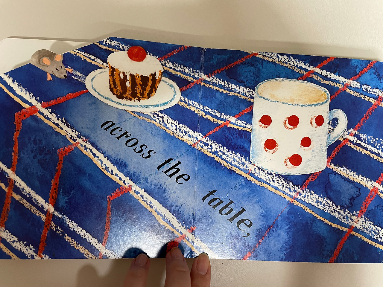 <Run, Mouse, Run>은 쥐가 고양이에게 잡혀먹지 않기 위해 도망 다니는 상황을 그린 책이다. ‘over the chair(의자 위로)’, ‘across the table(테이블을 가로질러)’, ‘up the cup(컵 위로)’ 등등의 부사구들을 볼 수 있다. 부사구에 딱 맞는 삽화가 인상적이다. 만 1살인 딸에게 그저 그림책을 보여주며 읽어주면 그 의미를 바로 캐치할 수 있을 것 같은 느낌이 들 정도로.