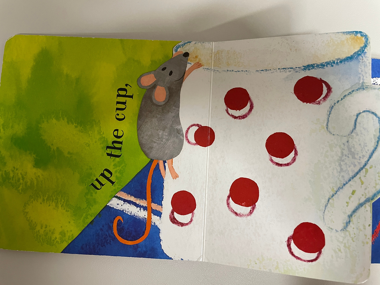 제시된 영어 표현들이 추상적이지 않고 구체적인 어휘에 짧아 삽화를 더 직관적으로 표현하기 쉬웠을지도 모르나 삽화만으로 영어를 이해하기에 충분하다는 것은 이 책을 본 분들도 쉽게 동의할 것이다. 그래서 딸에게 이 책을 읽어줄 때 굳이 우리말을 쓸 필요가 없었다. 영어를 읽어줄 때 삽화 속 쥐를 손으로 따라가거나 집에 있는 실제 의자, 컵, 식탁을 활용해 쥐의 행동을 따라 해서 딸이 더 이해하기 쉽도록 도왔을 뿐. 결국 딸은 삽화와 실제 사물, 그리고 엄마를 ‘보고 들었다’.