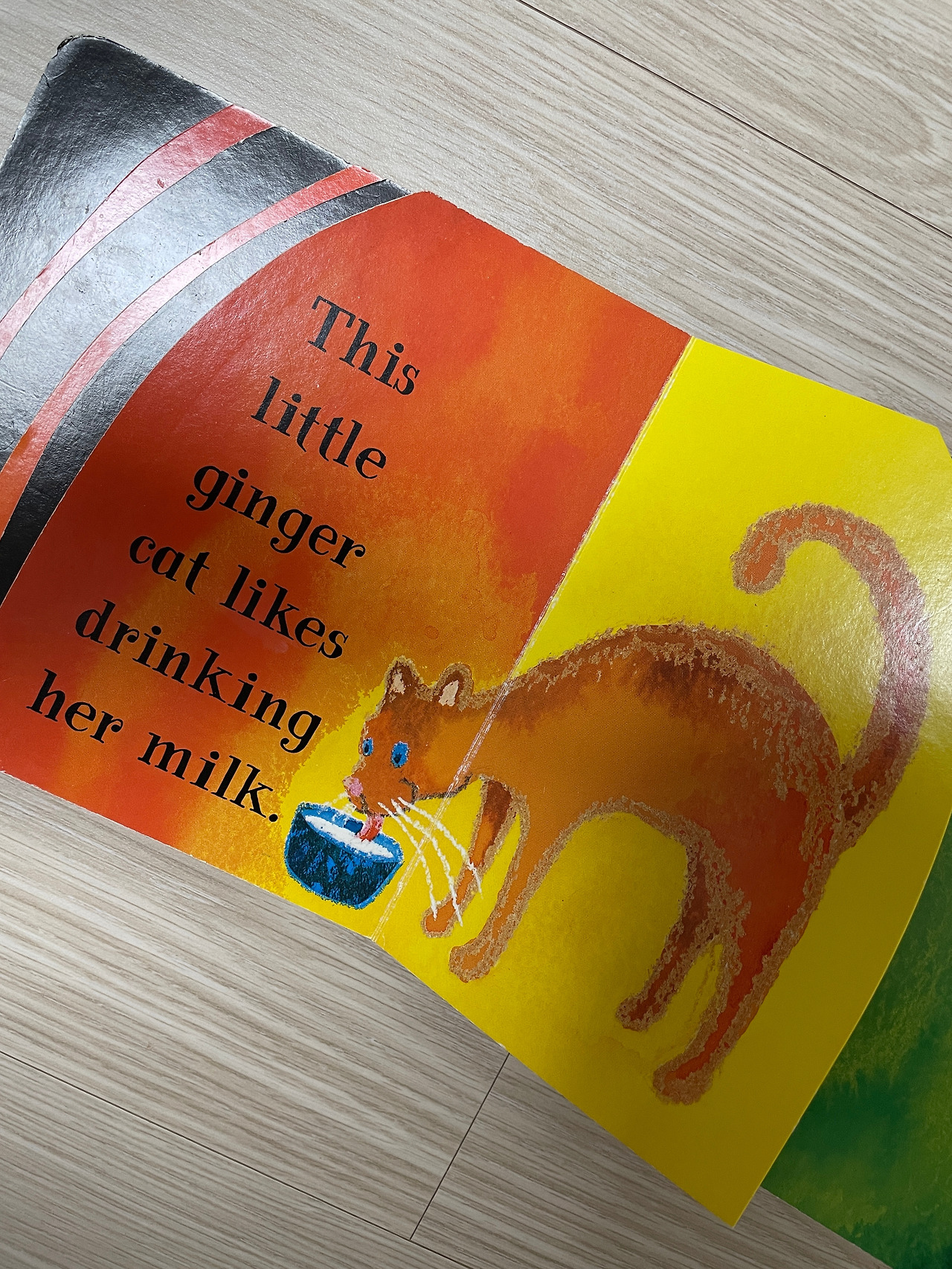 "회색 고양이네~ grey cat." 털뭉치를 가리키며 "wool"이라고 읽어주었다. ginger cat은 우리말로 해석해 주기보다 손가락으로 가리키며 바로 "ginger cat"이라고 읽어주었다. 회색은 다른 그림책들에서 본 적이 있고 읽어준 적이 있지만 ginger(생강색, 연한 적갈색)은 처음이라 우리말을 거치지 않고 그림이 나타내는 것을 바로 받아들이길 바라는 마음에서. "우유 먹고 있네. 우유. milk." 우유를 자주 들어왔던 딸은 귀를 쫑긋하고 듣는 듯했다. 삽화의 그릇에 담긴 흰색 우유를 보고 자신이 마셔왔던 우유와 동일시하며, milk를 우유로 그리고 그동안 자신이 마시며 봐왔던 우유와 똑같은 것으로 이해하지 않았을까 상상해 본다.