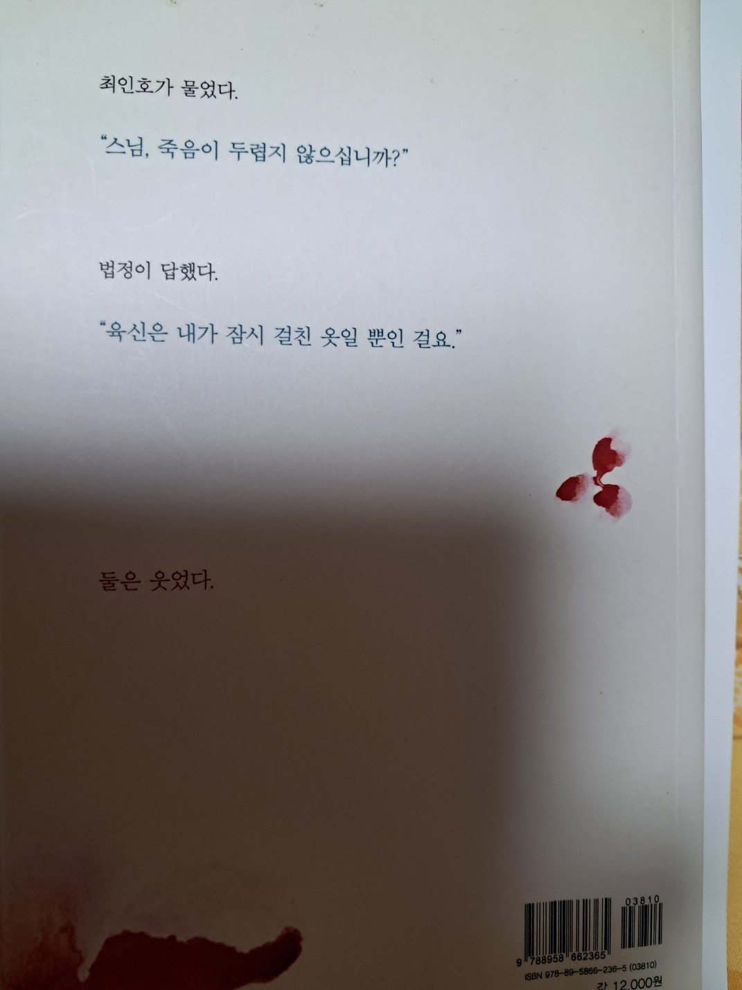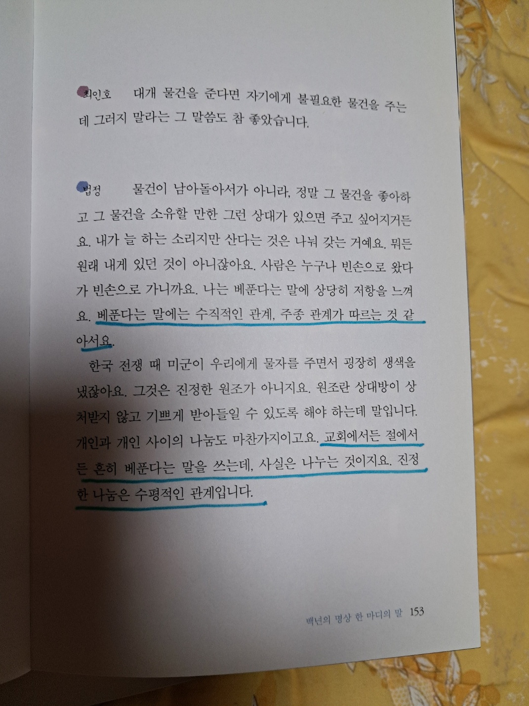 법정 : 그럼요, 사람은 때로 외로울 수 있어야 합니다. 외로움을 모르면 삶이 무디어져요. 하지만 외로움에 갇혀 있으면 침체되지요. 외로움은 옆구리로 스쳐 지나가는 마른 바람 같은 것이라고 할까요. 그런 바람을 쏘이면 사람이 맑아집니다.