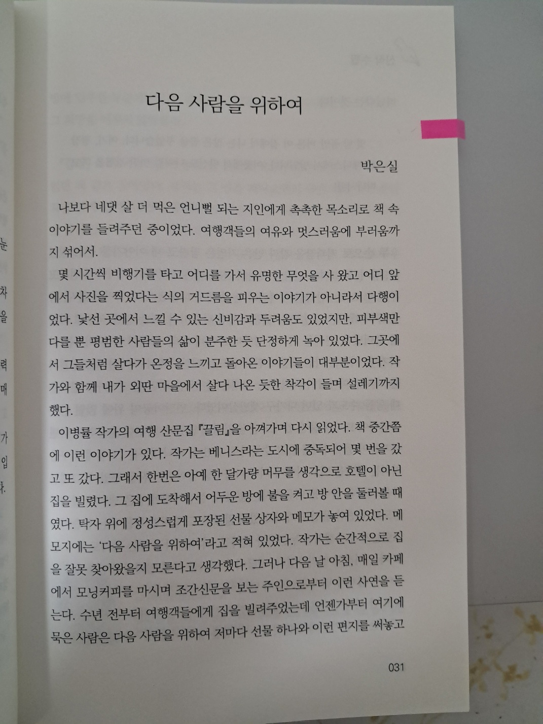 이병률 작가의 여행 산문집 『끌림』을 아껴가며 다시 읽었다. 책 중간쯤에 이런 이야기가 있다. 작가는 베니스라는 도시에 중독되어 몇 번을 갔고 또 갔다. 그래서 한 번은 아예 한 달가량 머무를 생각으로 호텔이 아닌 집을 빌렸다. 그 집에 도착해서 어두운 방에 불을 켜고 방 안을 둘러볼 때였다. 탁자 위에 정성스럽게 포장된 선물 상자와 메모가 놓여 있었다. 메모지에는 ‘다음 사람을 위하여’라고 적혀있었다. 작가는 순간적으로 집을 잘못 찾아왔을지 모른다고 생각했다. 그러나 다음 날 아침, 매일 카페에서 모닝커피를 마시며 조간신문을 보는 주인으로부터 이런 사연을 듣는다. 수년 전부터 여행객들에게 집을 빌려주었는데 언젠가부터 여기에 묵은 사람은 다음 사람을 위하여 저마다 선물 하나와 이런 편지를 써 놓고 떠났다는 것이다.