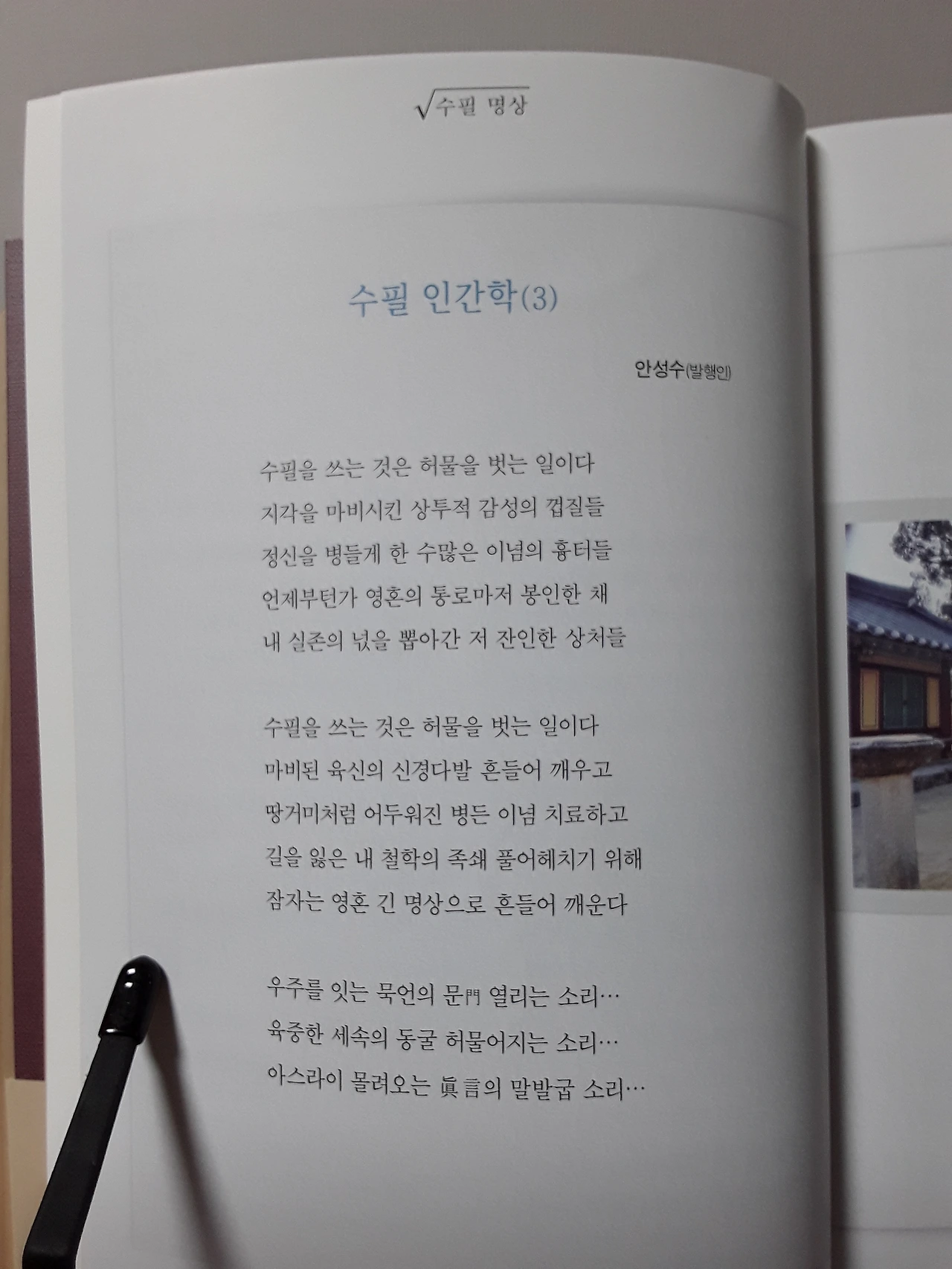 안성수발행인의 시 <수필 인간학> 이, 다음 페이지에는 김수오 편집장의 <조선의 신전, 종묘>가 실려 이 수필지의 위상을 가늠하게 했다.