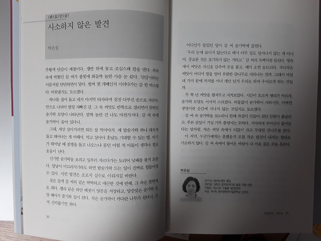 “우리 눈에 보이지 않는다고 해서 아무 일도 일어나지 않는 게 아니야. 중요한 것은 포기하지 않는 거라고.” 감 씨의 독백처럼 들린다. 땅속에서 씨앗은 자신을 감추며 꿈을 품고, 때가 오면 움트리라. 작디작은 씨앗이 어디서 힘을 얻어 우람한 감나무로 자라나는 걸까. 그래서 마침내 가지 끝에 까치밥 서너 개만 남겨 우리로 하여 우러르게 하는 것일까.