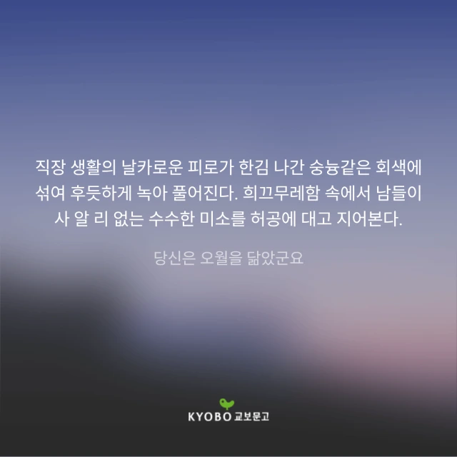 낮과 밤이 섞이는 퇴근 무렵, 희끄무레한 저녁이 내려앉는다. 여느 때야 새뜻한 달 하나가 떠오르길 바랐겠지만 이번만은 그렇지 않다고 해도 성내지 않겠다. 하루에도 몇 번씩 다닐까 말까를 고민하는 직장인인 내가 중용의 도를 겨자씨만큼이나마 깨우친 까닭에서일까. 직장생활의 날카로운 피로가 한 김 나간 숭늉 같은 회색에 섞여 후틋하게 녹아 풀어진다. 희끄무레함 속에서 남들이사 알 리 없는 수수한 미소를 허공에 대고 지어본다.
