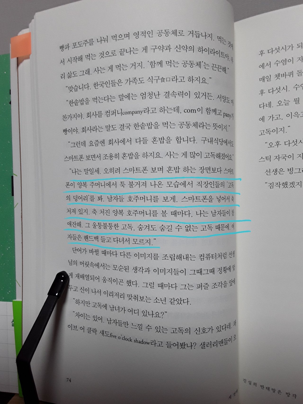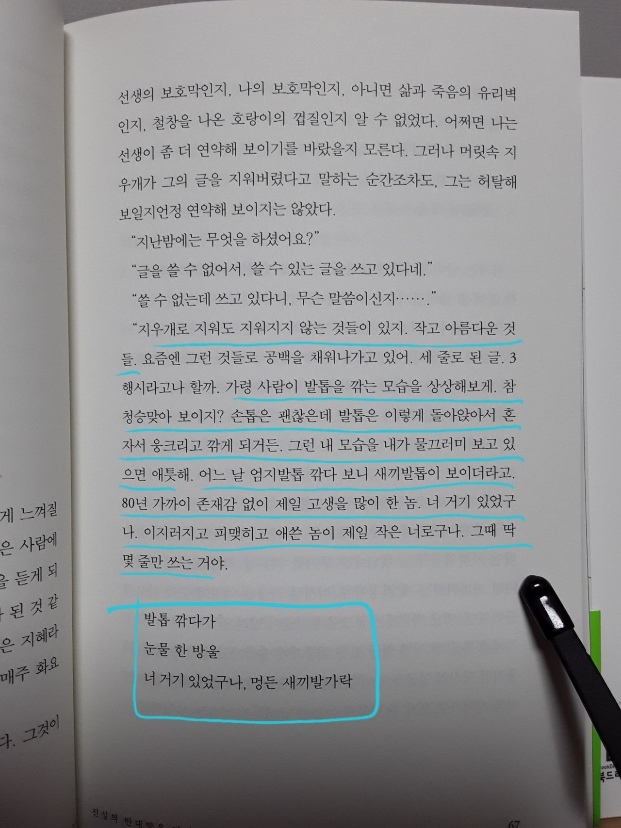 작년이었던가요? 베스트셀러였던 이 책을 사서 설레면서 책장을 펼쳤습니다. 한 자 한 자 읽어가는데 명문장들로 숨이 막히는 듯했었어요. 페이지 페이지 마다