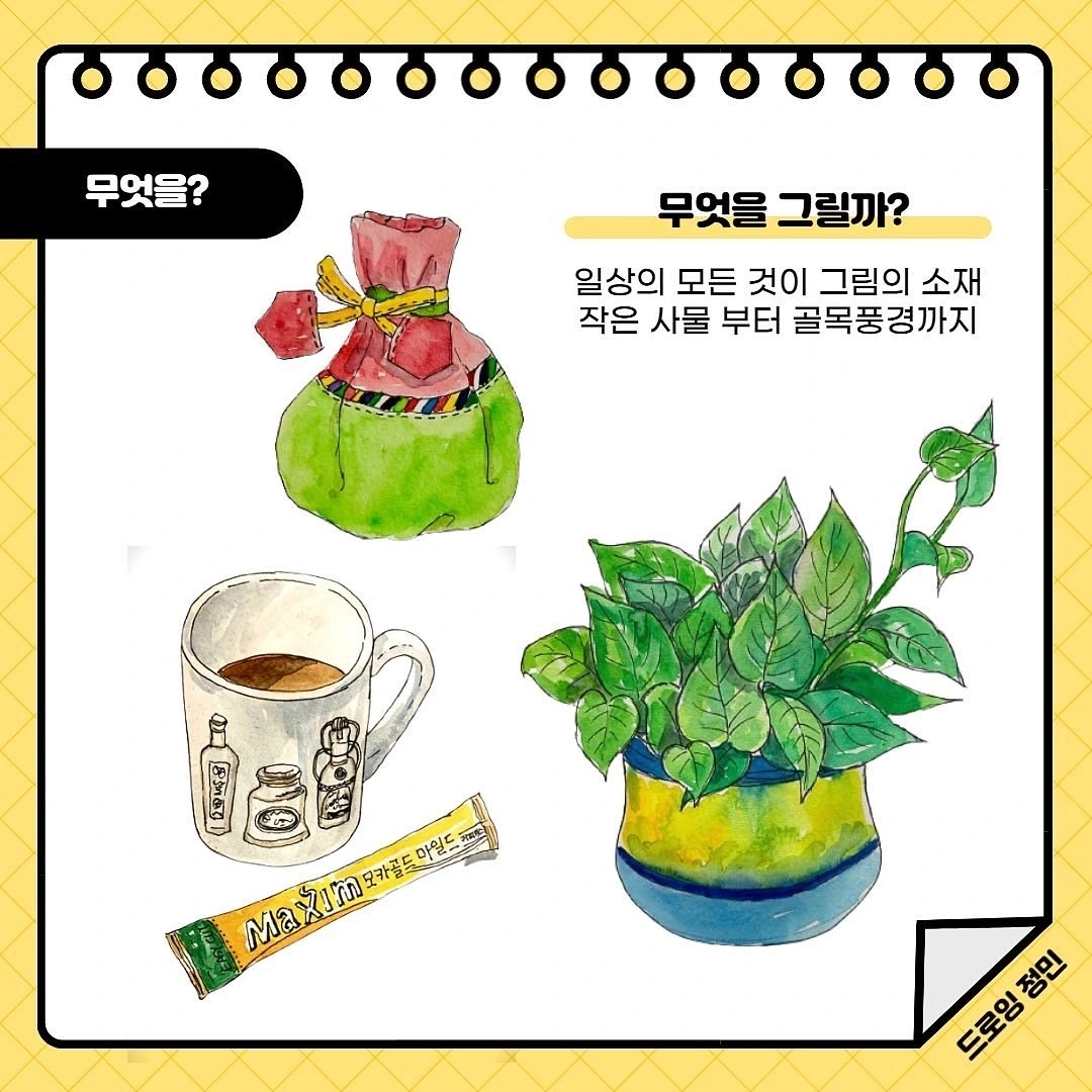 내가 생각하는 그림에 대한 정의와 일상에서 누구나 쉽게 그릴 수 있다는 내용이다. 곳곳에 예시로 내 그림과 동아리 활동 모습 그리다 멤버들의 그림 등 을 넣어 직접 책의 형태로 편집까지 한 PDF 파일로 만들었다. 중간중간 강사님의 피드백과 교정이 들어갔고 최종 표지 디자인과 플랫폼에 노출되는 썸네일 작업까지 각자가 다 스스로 했다.