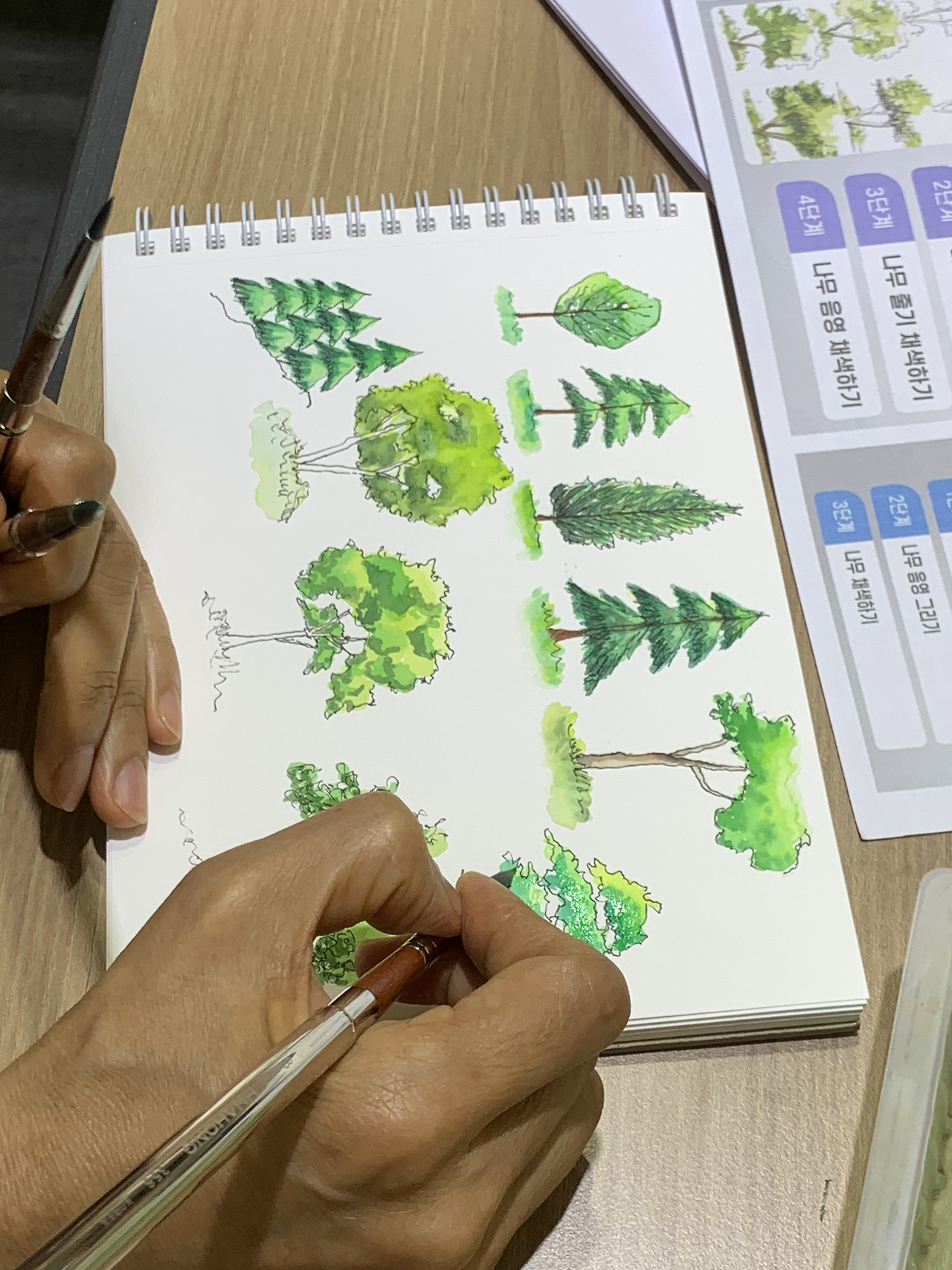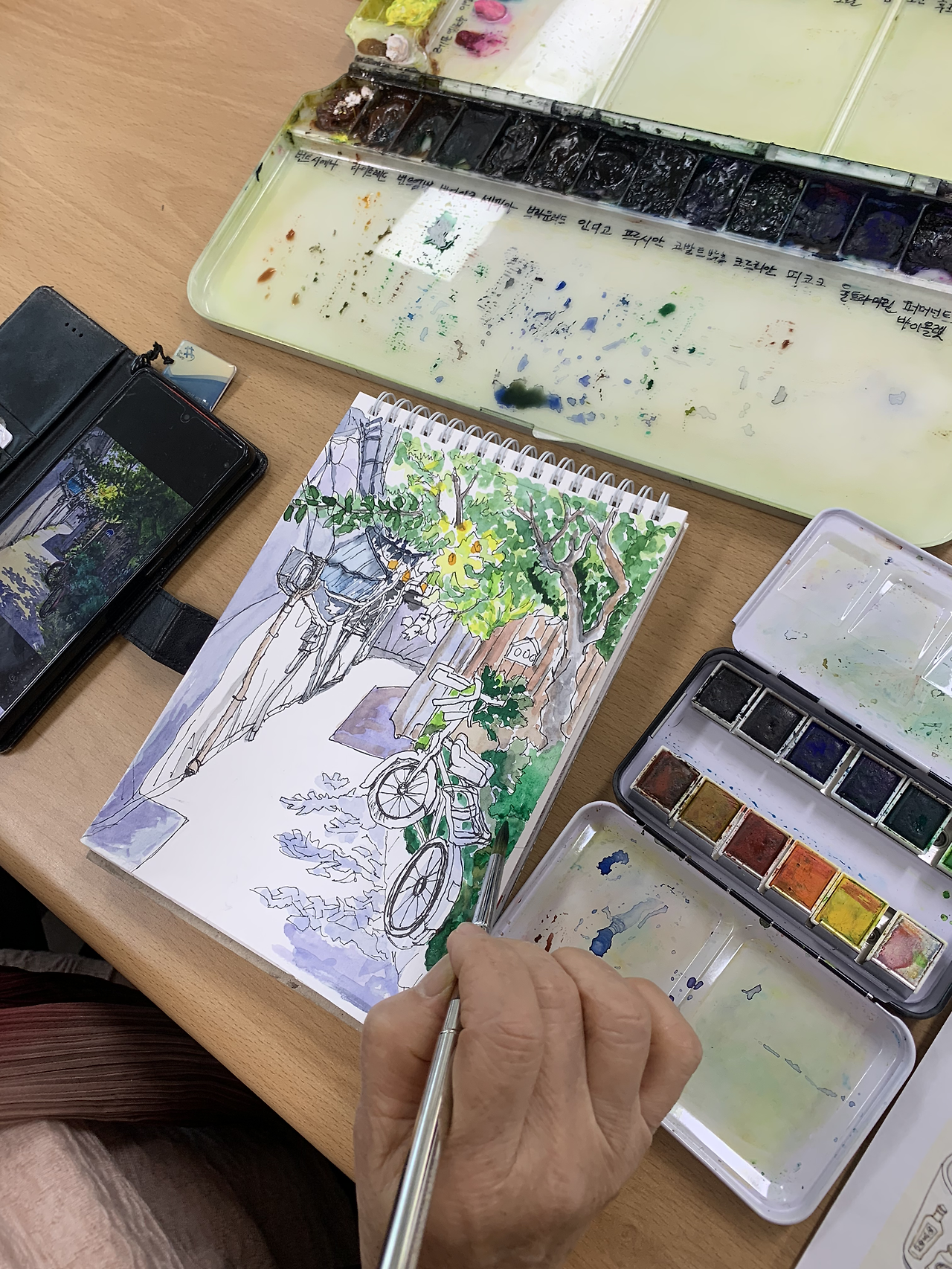 성인을 대상으로 펜 드로잉과 수채화 수업을 한다.