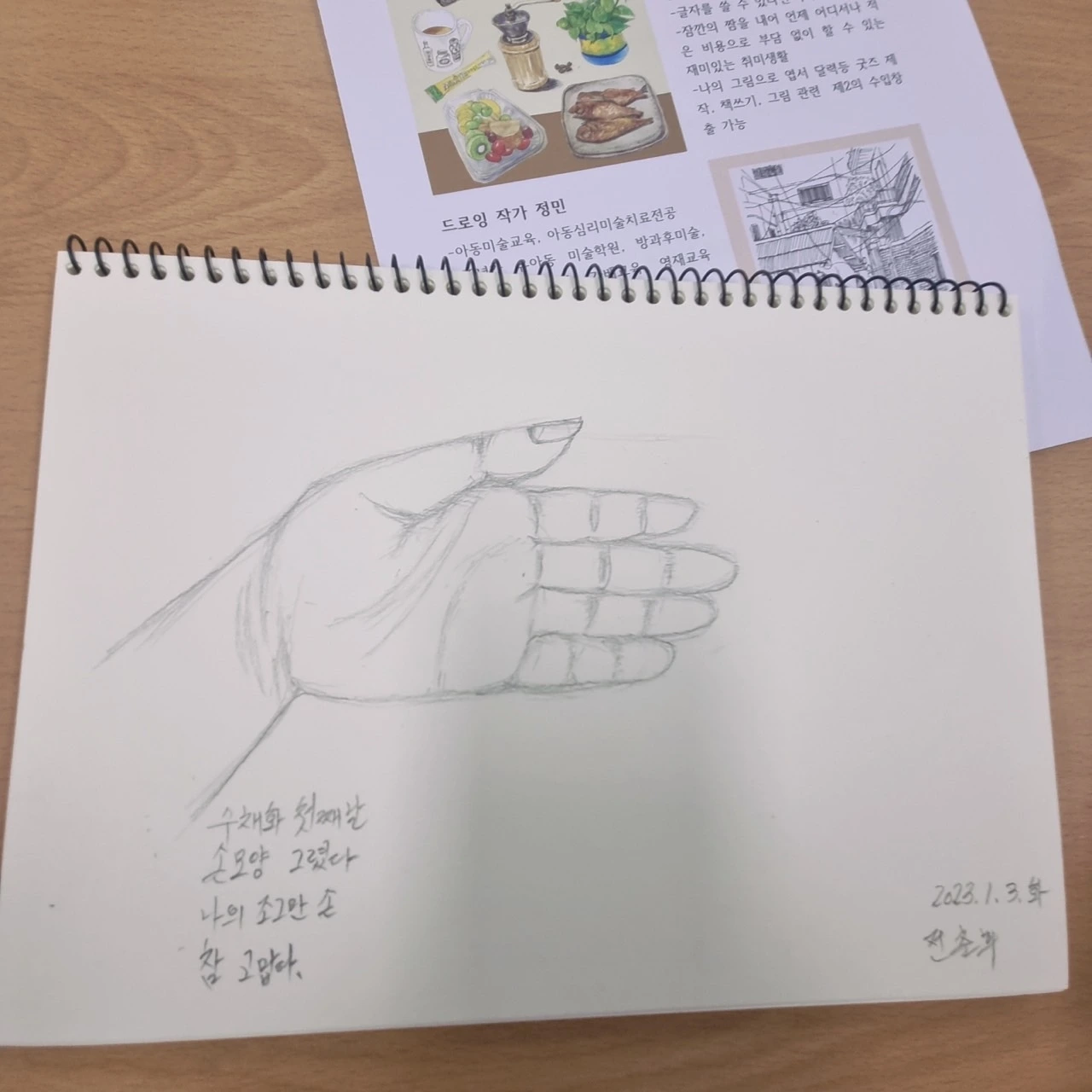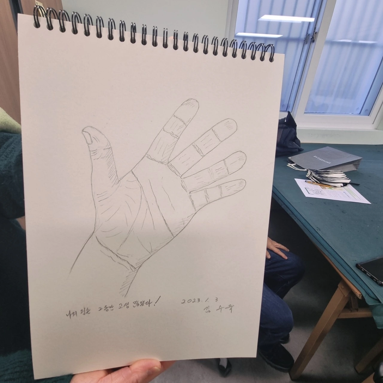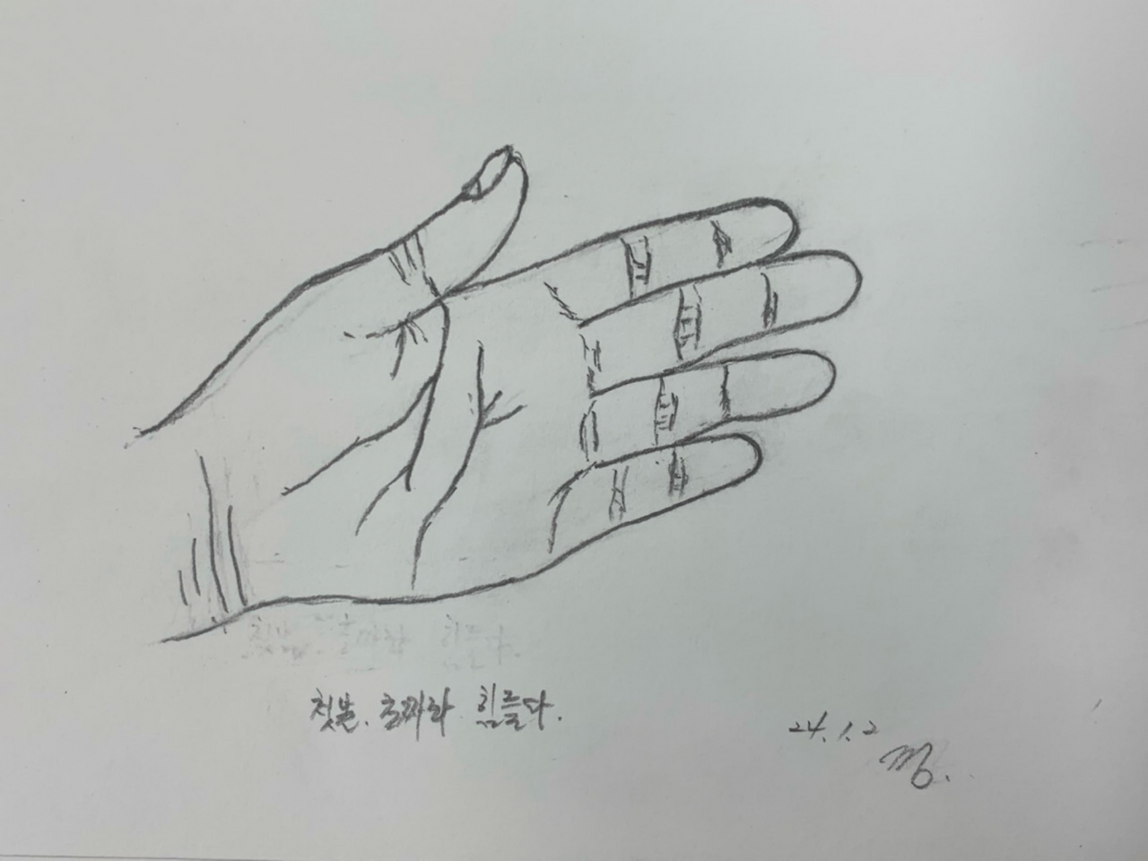 손 그림을 마치며 완성된 손 그림에 제법인데 하고 마음에 들어하시며 자신감이 슬쩍 올라간다.