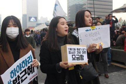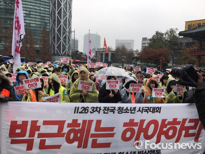 청소년 단체 '중고생연대'의 평화 시위와 거리행진, 대구 여고생 시국 선언 등으로부터 시작된 "박근혜-최순실 게이트"에 대항하는 청소년들의 행동은 전국 중고등학교 곳곳에 붙은 대자보와 학생회의 시국선언이 더해지며 성장했다. 몇 주 전 지방 청소년들의 집회 참여를 위한 교통비 모금에는 4800만 원이란 거액이 모였으며, 그 결과 민중총궐기 대회가 열린 11월 12일 '21세기청소년행동희망'이 탑골공원에서 개최한 전국 청소년 시국 대회에는 약 5000여 명의 청소년이 참가할 수 있었다. 다른 청소년 집회 인원을 더하면 1만, 광화문 시위에 참여한 이들까지 합치면 그 인원은 더 늘어날 것이다.