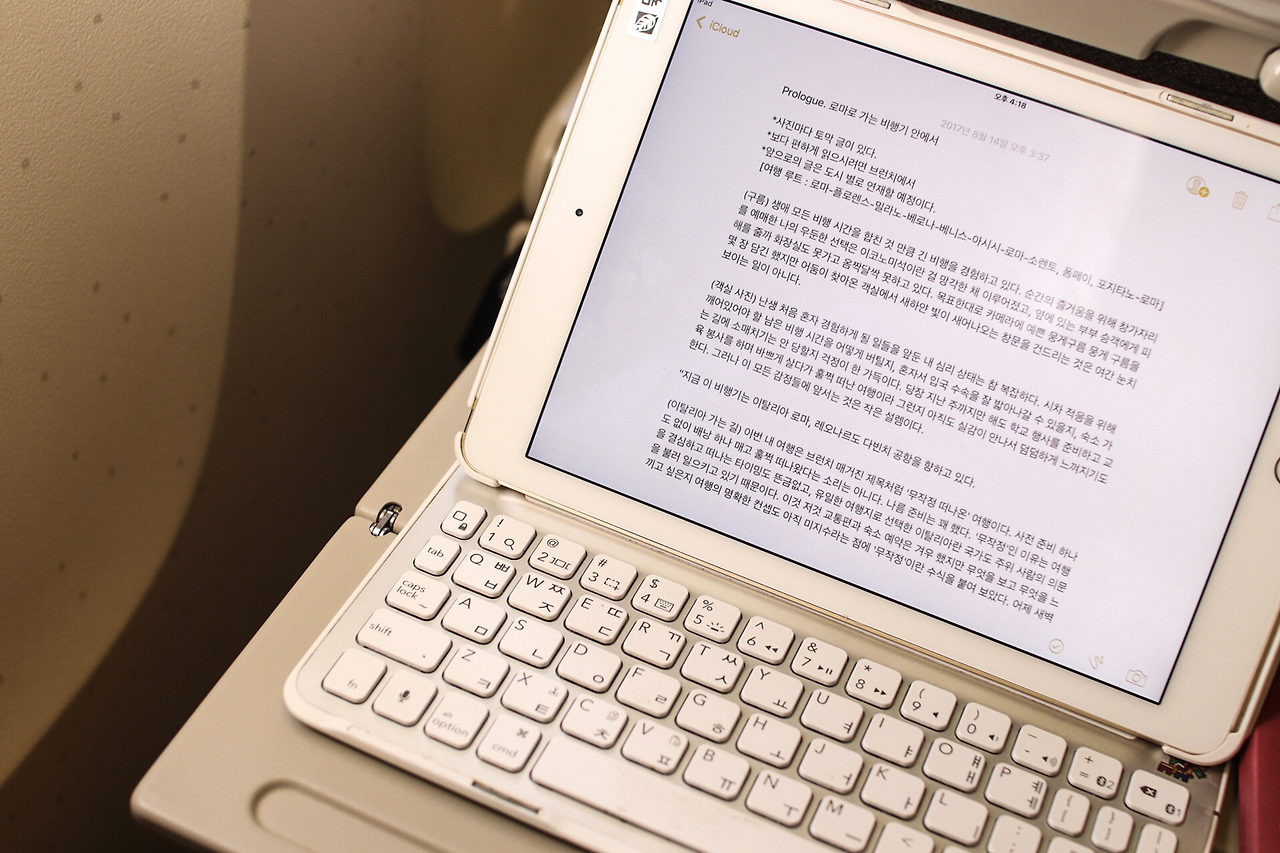 생애 모든 비행시간을 합친 것만큼 긴 비행을 경험하고 있다. 순간의 즐거움을 위해 선택한 창가 자리 예매는 이코노미석에서 13시간 비행이란 걸 깜빡한 채 이루어졌고, 옆에 있는 부부 승객에게 피해를 줄까 화장실도 못 가고 옴짝달싹 못하고 있다. 목표한 대로 카메라에 예쁜 뭉게구름을 몇 장 담긴 했지만 어둠이 찾아온 객실에서 조금만 건드려도 새하얀 빛이 새어 나오는 창문을 연다는 것은 여간 눈치 보이는 일이 아니다.