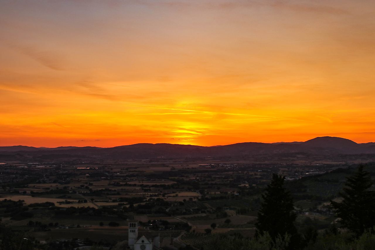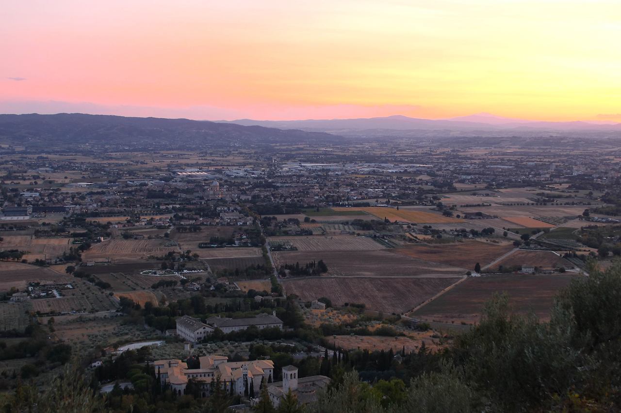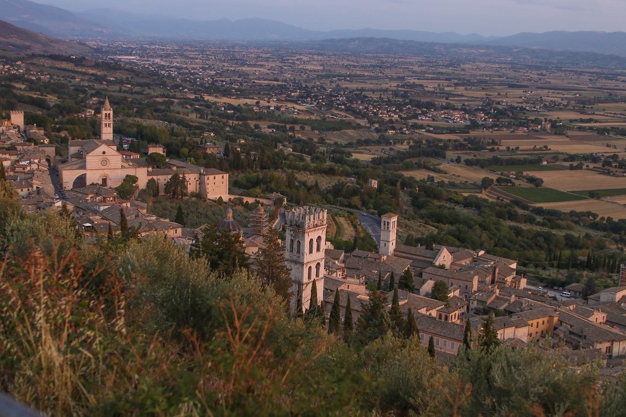 생각보다 좋았던 숙소에서 여유를 부리다가, 또 중세 풍 건물들을 렌즈에 담아내느라 저녁노을의 골든타임은 이미 훌쩍 지나가버렸었다. 해는 이미 반쯤 산 뒤에 모습을 가리고 있었다. 골목골목 들어오는 노을빛을 보며 어서 올라가야겠다는 생각이 들면서도, 노을빛에 물든 건물도 꽤나 아름다워서 앞만 보고 갈 수는 없었어서 늦어버린 것이다. 계획보다 늦은 시간에 로카 마조레에 올라 처음 본 풍경은 아시시의 도시 전경과 그 옆에 펼쳐진 움브리아 평원의 모습이었다. 높은 곳에서 바라본 아시시는 생각보다 훨씬 작았고, 움브리아 평원도 훨씬 소박했다. 주홍색 지붕으로 빽빽한 전형적인 이탈리아의 전경도 멋이 있지만 때론 이런 여백이 훨씬 아름답게 느껴질 때도 있는 것 같다.