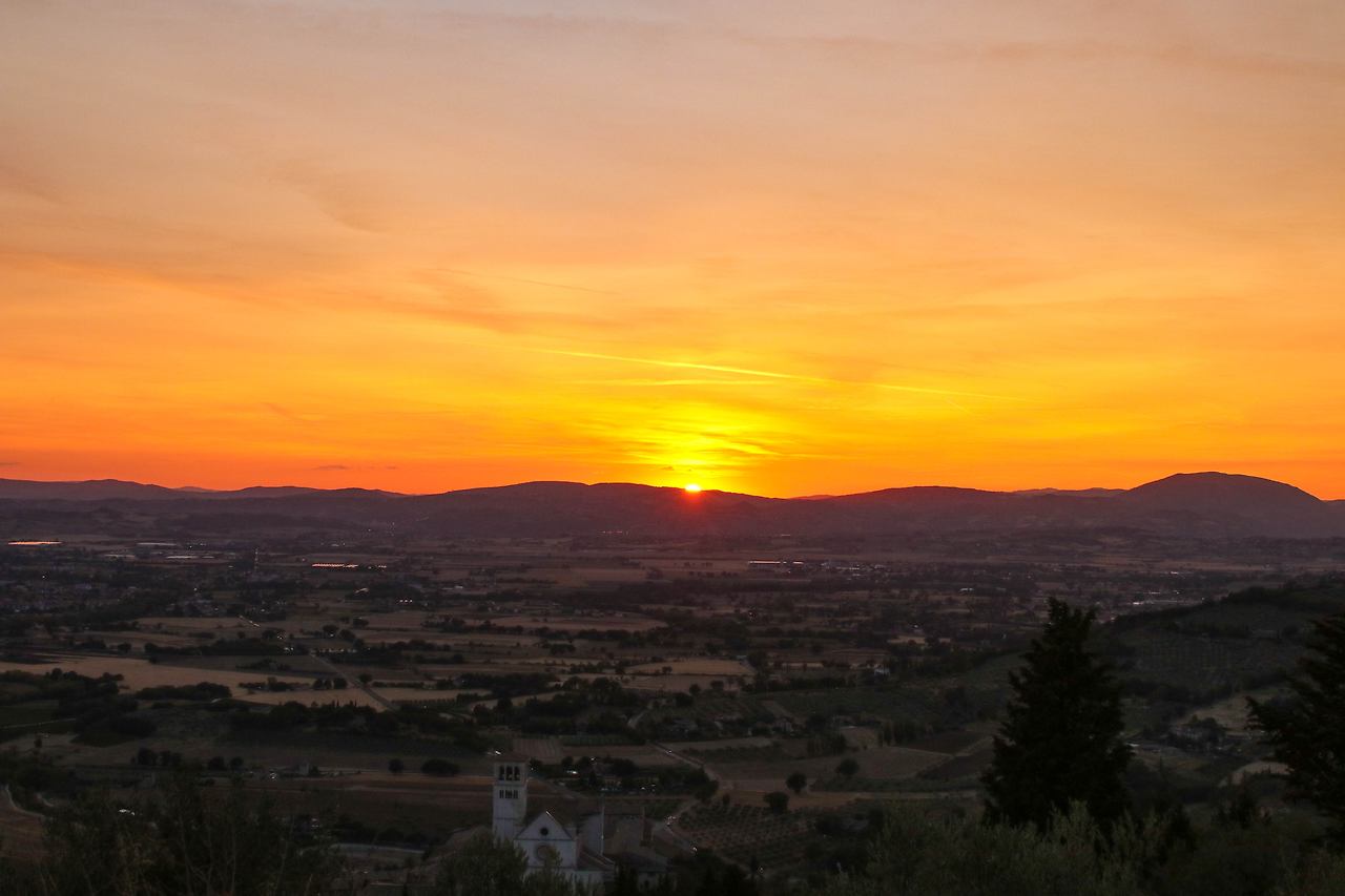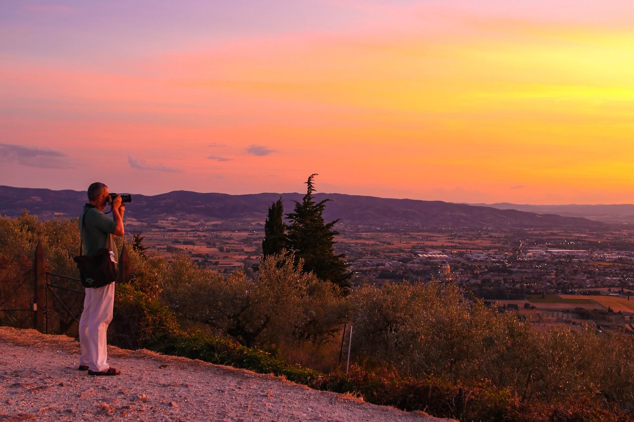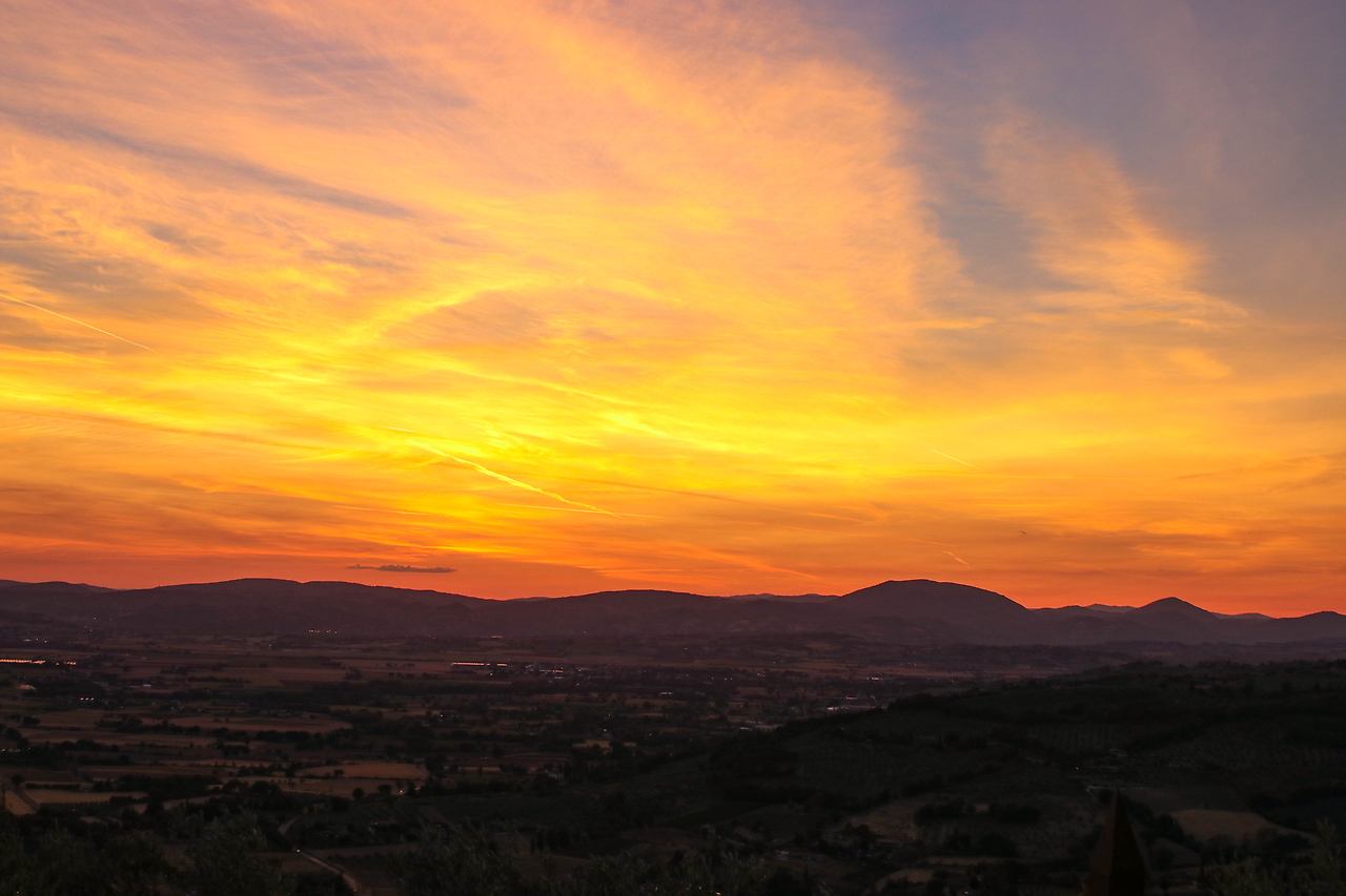 생각보다 좋았던 숙소에서 여유를 부리다가, 또 중세 풍 건물들을 렌즈에 담아내느라 저녁노을의 골든타임은 이미 훌쩍 지나가버렸었다. 해는 이미 반쯤 산 뒤에 모습을 가리고 있었다. 골목골목 들어오는 노을빛을 보며 어서 올라가야겠다는 생각이 들면서도, 노을빛에 물든 건물도 꽤나 아름다워서 앞만 보고 갈 수는 없었어서 늦어버린 것이다. 계획보다 늦은 시간에 로카 마조레에 올라 처음 본 풍경은 아시시의 도시 전경과 그 옆에 펼쳐진 움브리아 평원의 모습이었다. 높은 곳에서 바라본 아시시는 생각보다 훨씬 작았고, 움브리아 평원도 훨씬 소박했다. 주홍색 지붕으로 빽빽한 전형적인 이탈리아의 전경도 멋이 있지만 때론 이런 여백이 훨씬 아름답게 느껴질 때도 있는 것 같다.