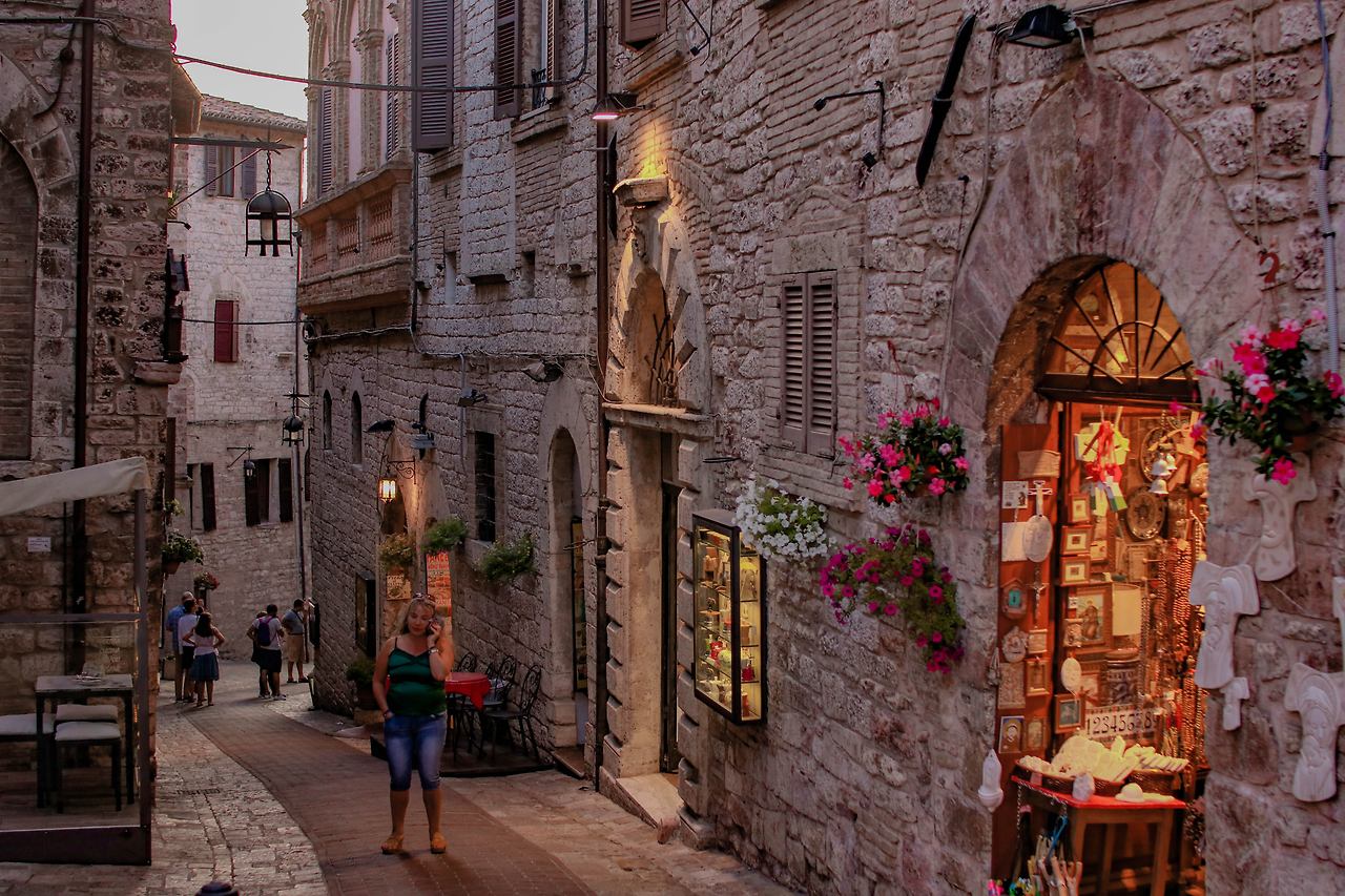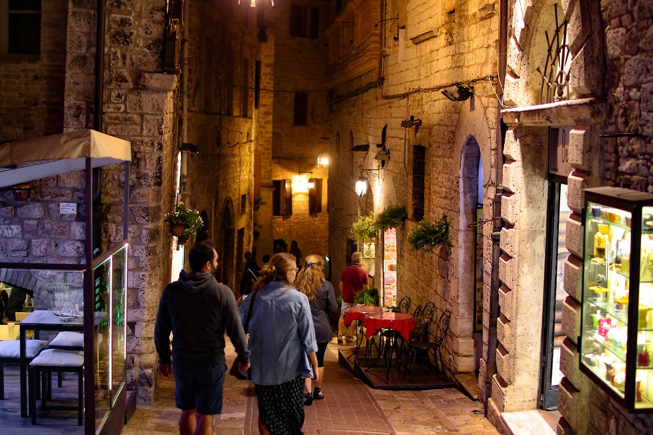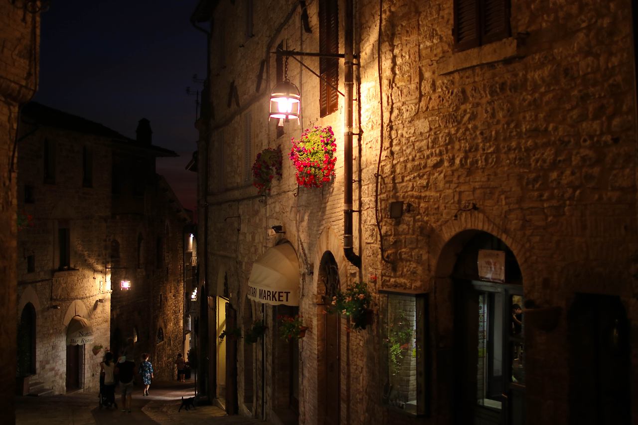 초저녁 하늘의 푸른빛이 모두 사라지는 것까지 보려고 했는데 갑자기 불어오는 찬 바람에 쫓겨 일찍 내려올 수밖에 없었다. 계속해서 뒤를 돌아보게 되는 절경에 발을 떼기 힘들었지만, 눈 앞에 펼쳐진 또 다른 풍경에 흠뻑 빠져 아쉬움은 곧 사라졌다. 은은한 조명이 퍼지던 아시시 골목길 특유의 질감이 참 좋았다. 부라노섬처럼 집집마다 달려 있던 화분도 밤이 되어 반쯤 몸을 감추니 더 매력적으로 보였다. 소도시라 그런지 좁은 광장에 주민들이 옹기종기 모여 있었어서 밤이 깊어가도 활기가 넘쳤다.
