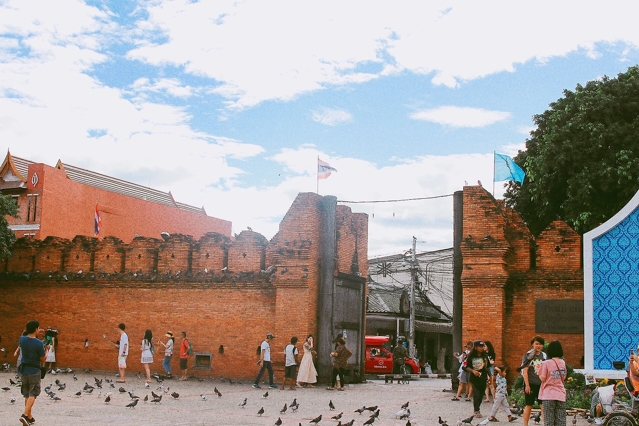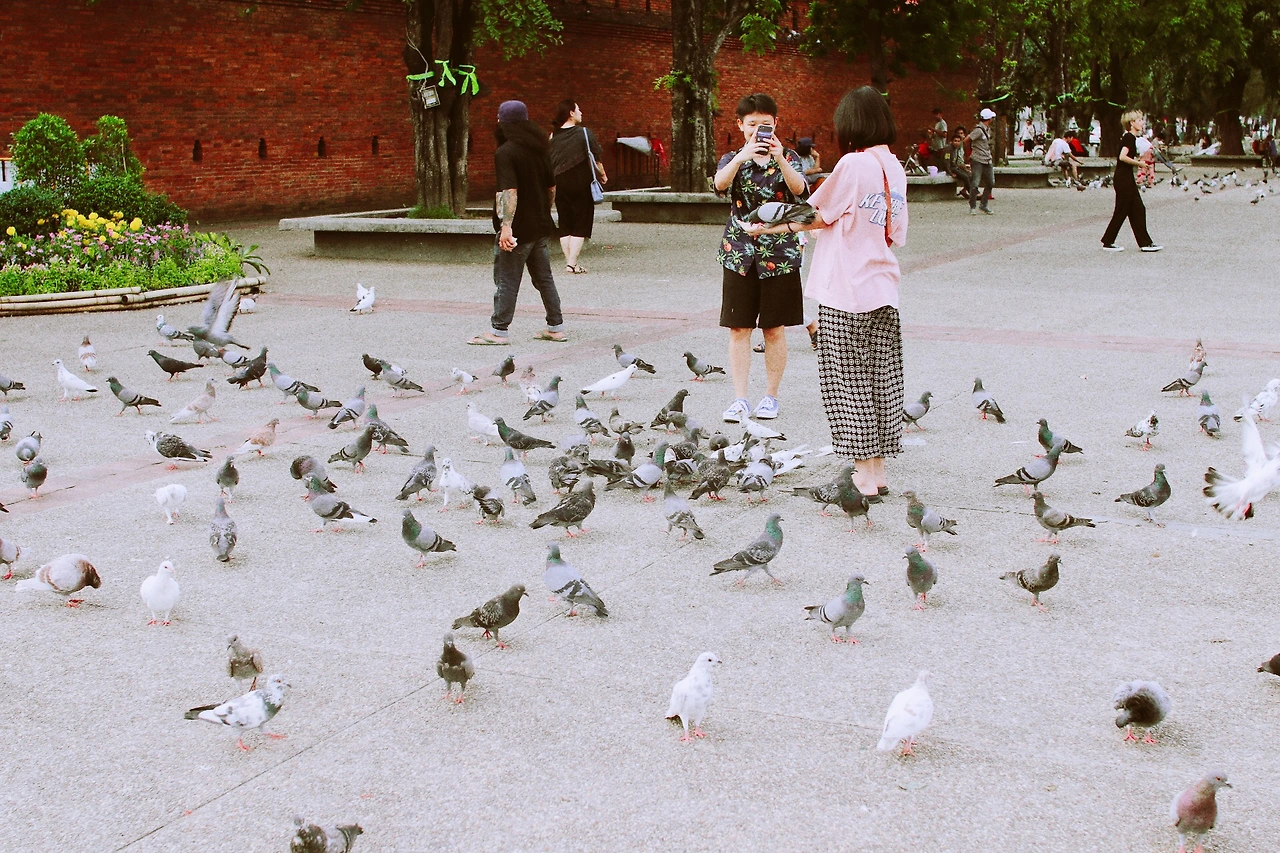 굳이 숙소 안돌아가고 음식점까지 간 이유는 맛집도 맛집이지만, 바로 앞에 ‘타페 게이트’때문이다. 올드타운 동쪽 성문인 타페 게이트 앞 광장에서는 매주 주말 큰 시장도 열고 쏭크란 같은 축제 때도 많은 행사를 진행한다고 한다. 지금은 그저 비둘기 광장이었다. 여행지마다 있는 넓은 광장의 닭둘기 떼와 관광객에게 먹이를 파는 잡상인들. 제일 싫어하는 풍경이다. 길거리 음식 때문에 배가 찬 상태로 저녁을 먹어 속이 안좋았는데 비둘기까지 잔뜩 보니 너무 짜증났다. 얼추 돌아가는 길은 익혀뒀지만 폰 배터리 없는게 불안하기도 했고, 금방 뒤를 돌아 숙소로 향했다.