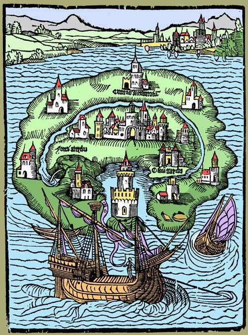 널리 알려진 '유토피아 섬'의 모습이다. '이상 사회'를 지칭하는 대명사가 된 유토피아(Utopia)는 영국의 정치가인 토마스 모어가 만든 단어로 원래 '현실에서 없는 곳'이라는 뜻이다. '유토피아'는 모어가 당시 영국 사회의 모습에 부조리를 느껴 이를 우회적으로 비판하기 위해 쓰인 책이다. 1부에선 등장인물 3명이 담화를 나누며 영국 사회의 정치적, 경제적, 사회적 모순점을 비판한다. 2부는 '라파엘'이란 인물이 유토피아 섬을 여행한 후 그 모습을 자세히 기술한 일종의 '여행기'로, 모든 사람이 경제적으로 평등하고, 차별 없이 풍요롭고 행복하게 사는 이상 사회의 모습을 제시하며 경제적으로 불평등하고, 사회적 차별 속에서 불행하게 살아가는 사회의 모습을 묘하게 풍자한다.
