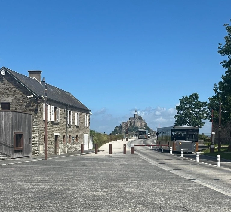 몽생미셸로 이어지는 해안가에는 호텔이 대여섯 개 있는 작은 마을이 있었어요. 도착했을 땐 12시 밖에 되지 않아 호텔Hôtel Saint-Aubert에 짐을 맡기고 걸어서 다리를 건너 몽생미셸로 갔습니다. 섬으로 향할수록 바람이 거세졌어요. 성벽에는 자전거가 줄 세워져 있었고, 갯벌을 맨발로 가로지르는 관광객도 많았습니다.