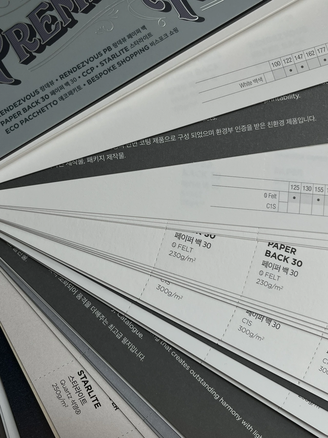 *반누보: 활엽수 펄프를 주로 쓰는 일반 인쇄용지와 달리 침엽수 펄프를 주원료로 사용해 탄력과 쿠션감이 뛰어난 수입지로, 러프그로스지의 대표격.