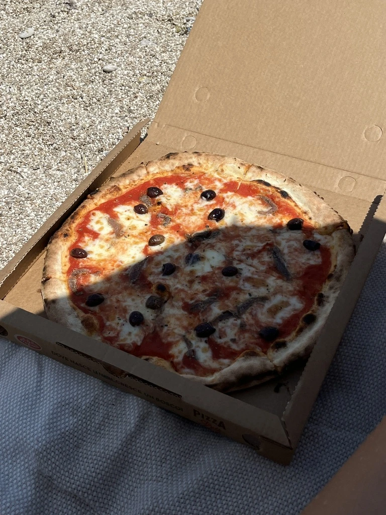 날씨 탓인지 Paloma보다는 Cros Dei Pin이 더 깨끗하다는 인상이다. Cros Dei Pin은 돌보다는 자갈로 되어 있다고 하는 게 맞겠다. 해변을 감싸는 산등성이를 바라보며 피자를 먹었다. 한국에서는 단 한 번도 피자 한 판을 혼자 먹어본 적 없는데 왜인지 수영을 하며 먹으니 자꾸만 피자가 들어갔다.