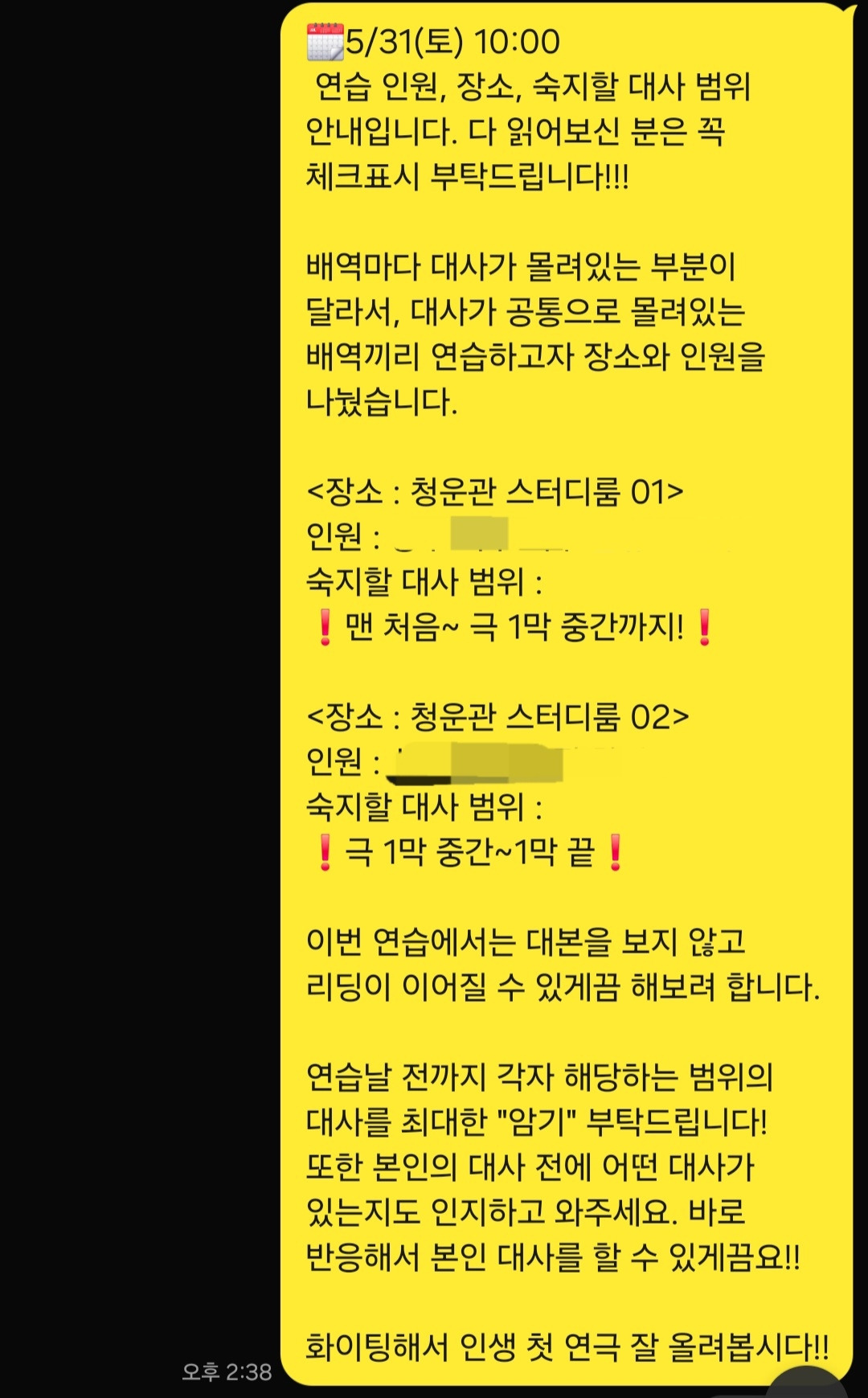 대사량을 파악한 결과 1막은 4명끼리, 2막은 5명끼리 연습할 수 있게 되었고, 이 내용을 다시 단체카톡방에 공유한다.