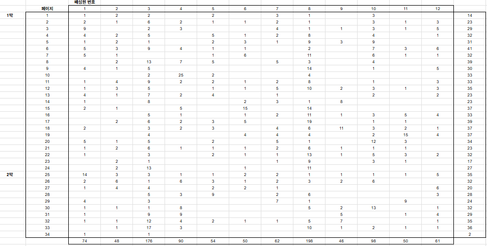 ... 그러니까 결국, 각 역할의 대사량을 하나하나 파악해야 한다는 거다. 뭐 어쩌겠는가. 그냥 하나하나 세 보면 될 일이다. 대본 한 페이지 당 평균적으로 30줄의 대사고, 모든 페이지를 살펴보면서, 각 페이지에 각 배심원의 대사가 몇 줄이 있는지 파악하는 것이다. 예를 들어, ctrl + F를 눌러 ‘1번’이라고 검색하면 1번 배심원에 하이라이트가 생기니 그걸 다 세면 된다. 파악한 건 스프레드시트에 도표 형식으로 기록하였다.