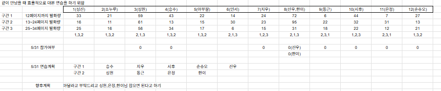 공연 2주 전에, 어떻게 하면 효율적으로 대사 연습을 할 수 있을까 고민하다가 문득 그때의 상황이 떠오르며 이런 생각이 들었다. '그럼 대사가 많은 사람들끼리 연습을 하면 되지 않을까?' 9명이서 모이면 9명이 같은 부분을 연습할 것인데, 그 부분에 대사가 적은 사람이 존재할 테다. 그것보다는, 4명 / 5명으로 각 구간 당 대사량을 기준으로 나누어서 대사가 많은 사람끼리 연습을 하게끔 만드는 게 효율적이다.