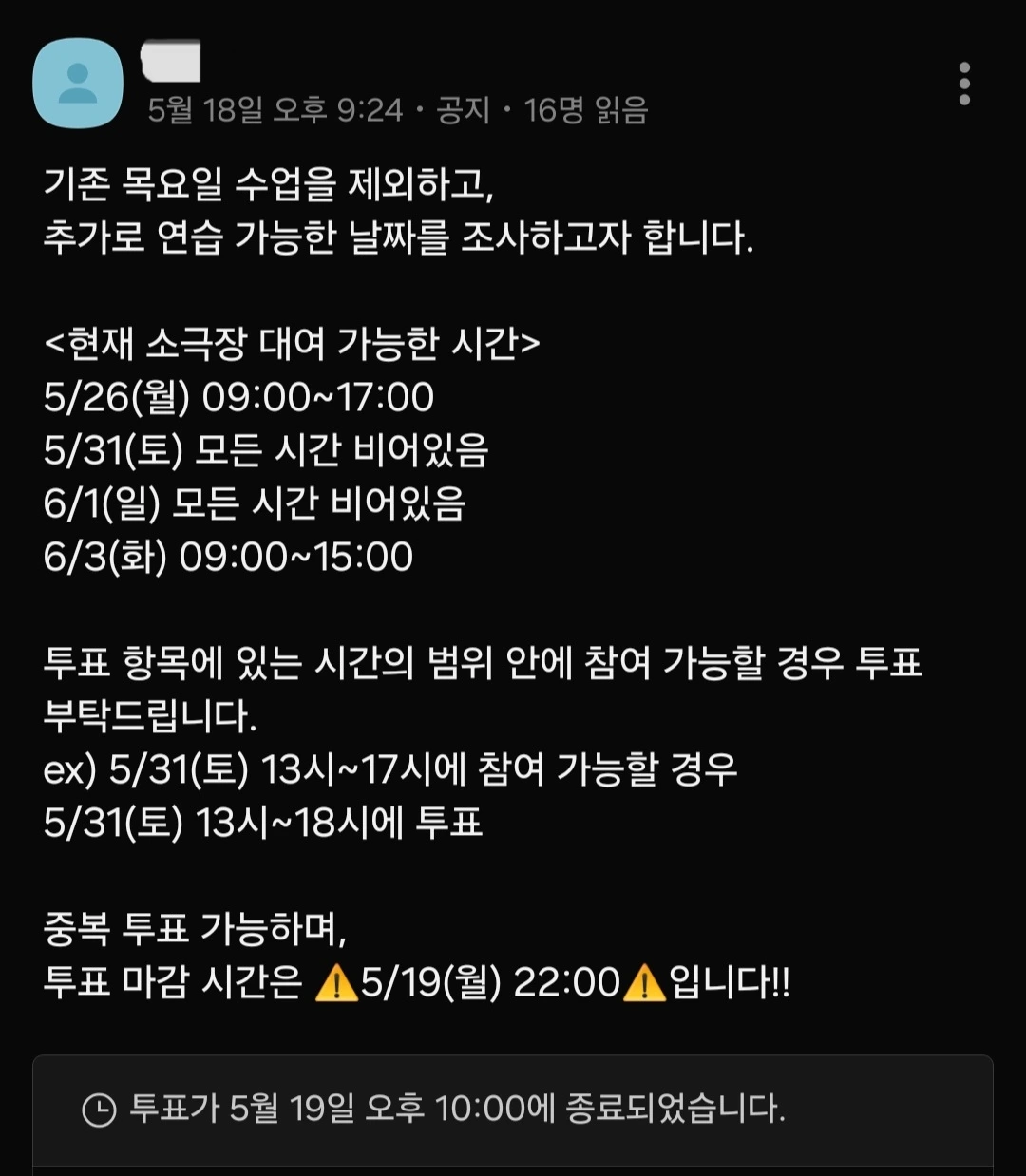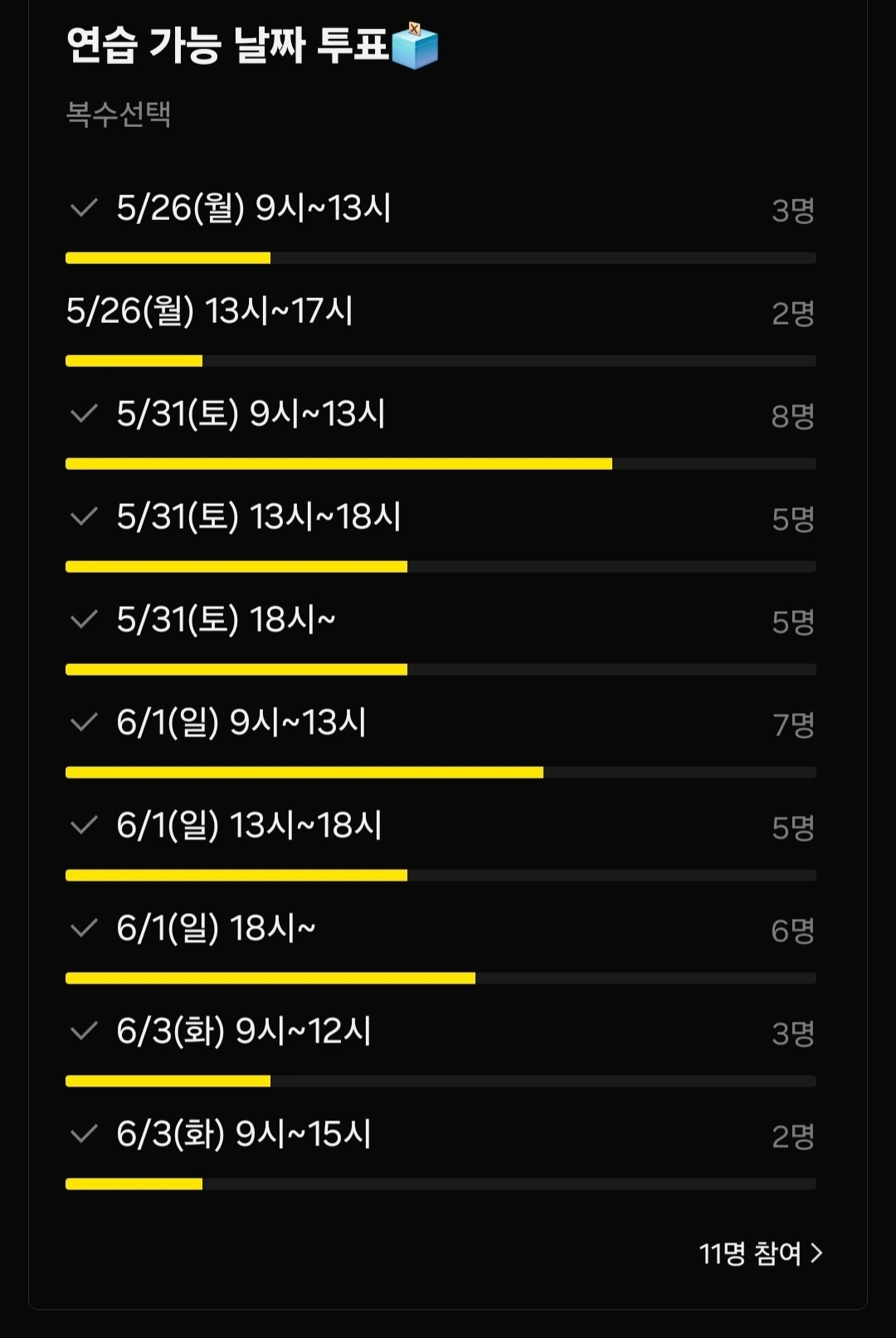 1. 연습 가능 날짜는 투표 항목으로 받고, 그 날짜에 대한 세부 시간을 댓글로 받을지